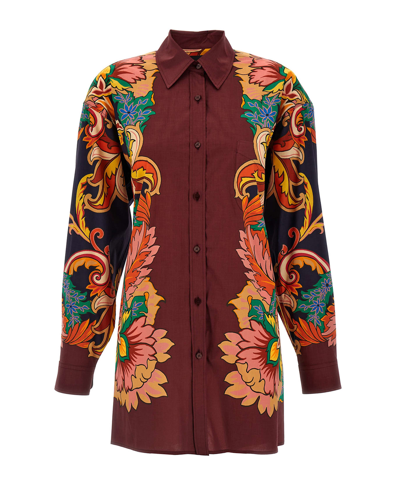 Light stretch cotton poplin shirt with maxi floral placed print inspired by the scarf, sidecut model with scarf detail and back knot, front button closure, breast pocket, long cuffed sleeves. Composition: 97% cotton, 3% elastane