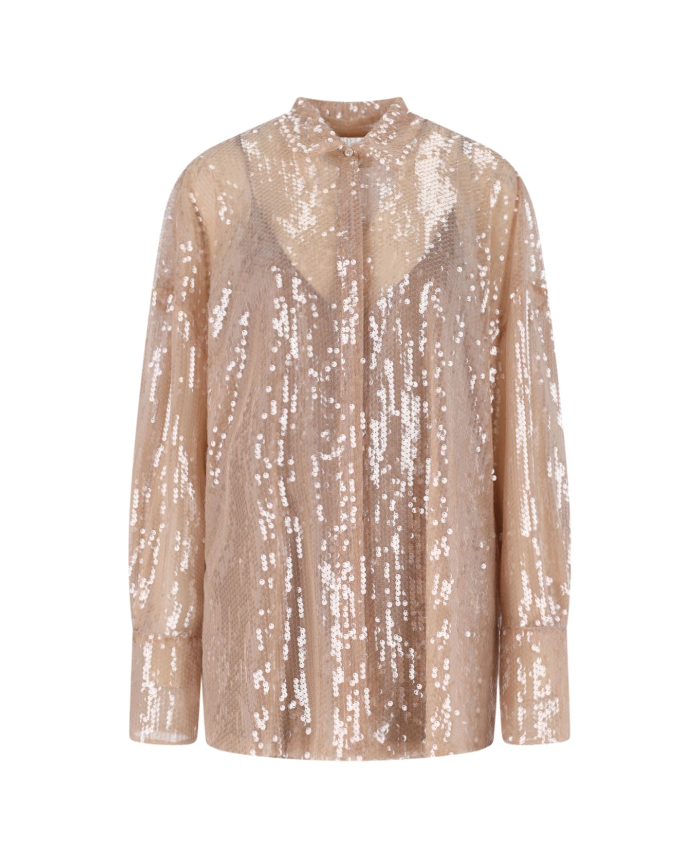 Giuseppe Di Morabito sequin shirt in beige fabric with classic collar, hidden button closure, button cuffs, flared hem.