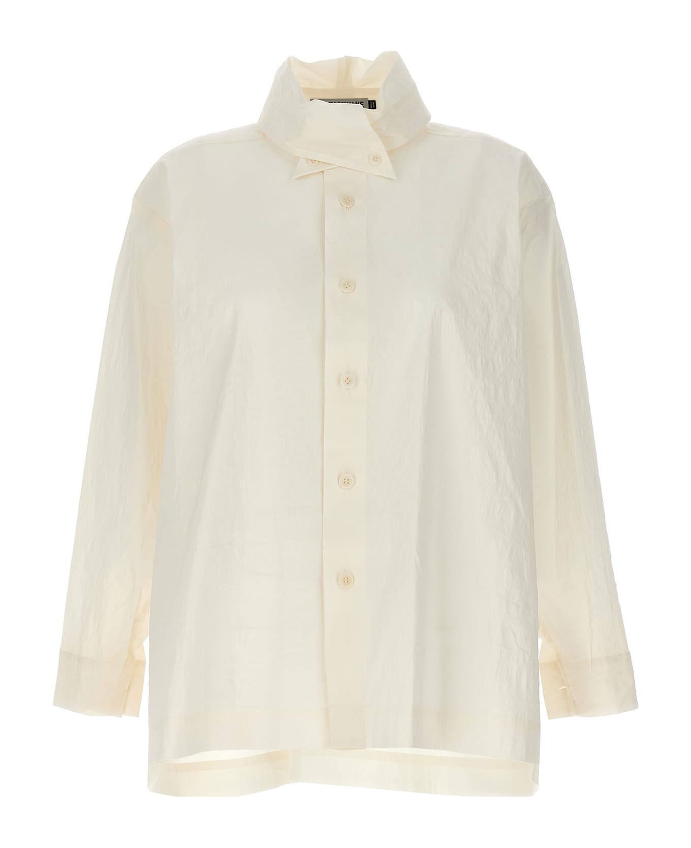 'Shaped Membrane' shirt in crinkled Japanese Washi paper blend with button closure, overlapping collar, long cuffed sleeves. Composition: 33% other fibers, 33% linen, 27% nylon, 7% polyurethane