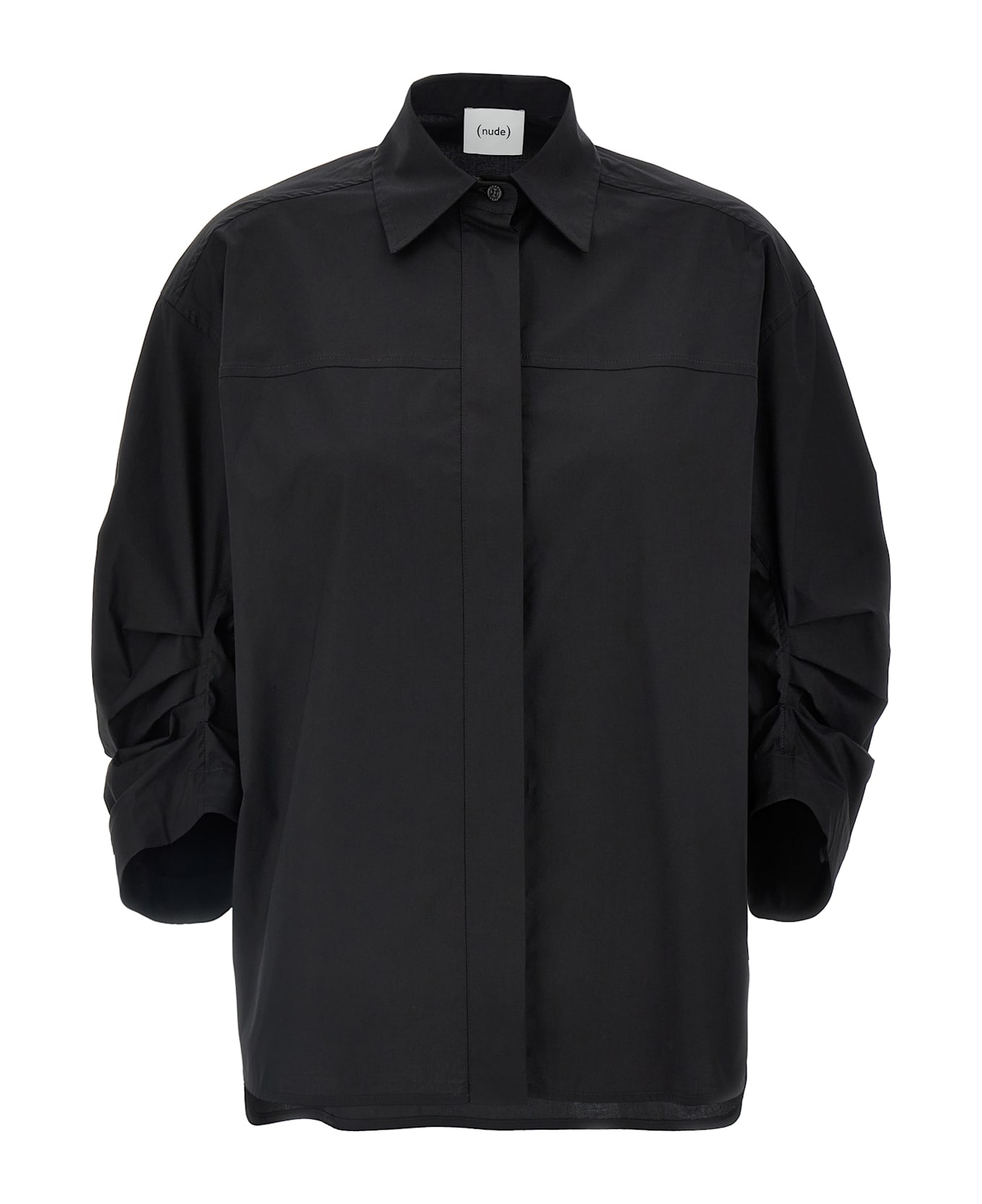 Stretch cotton poplin shirt with button closure, 3/4 crinkled sleeves, side slits.