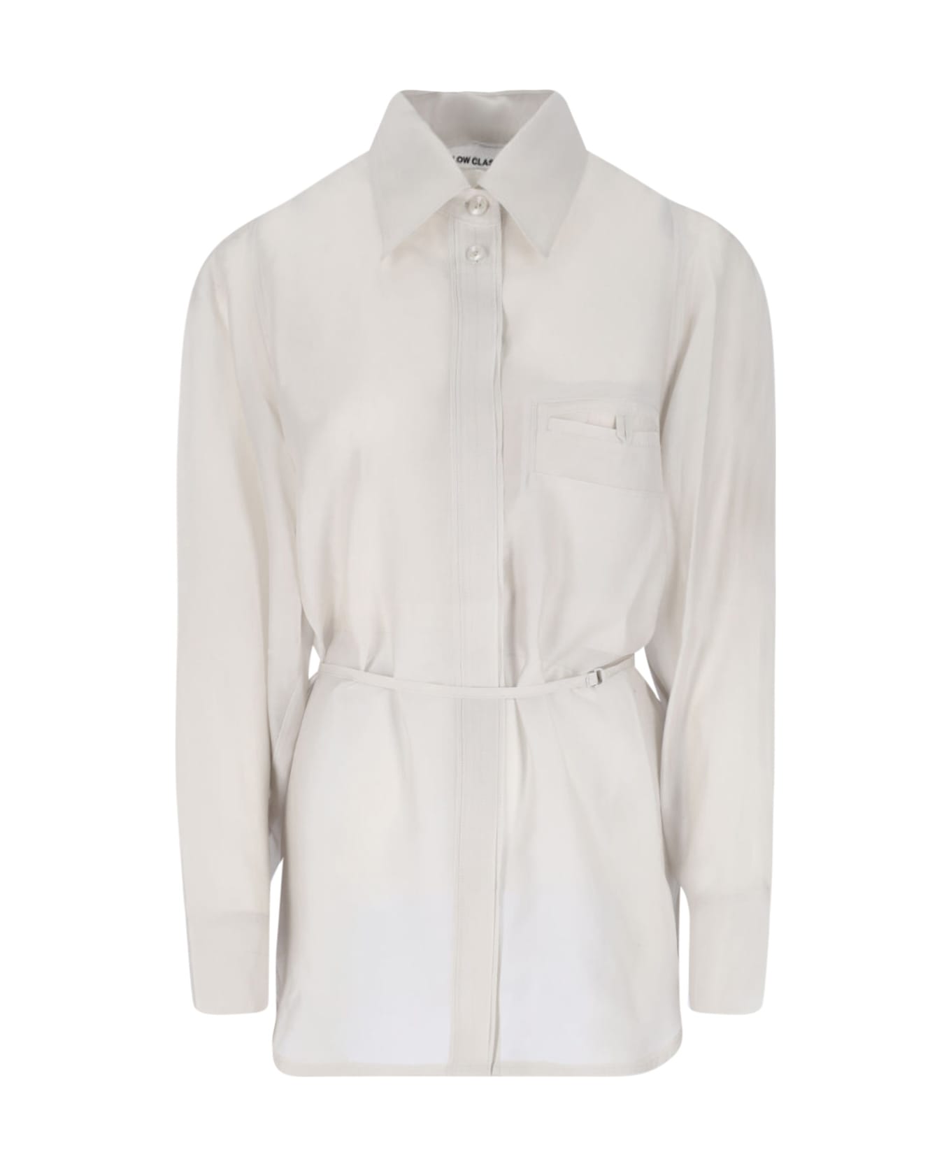 Low Classic belted shirt in beige fabric with classic collar, button closure, chest pocket, adjustable belt at the waist, button cuffs, curved hem. Composition: 84% Tencel, 16% Polyester