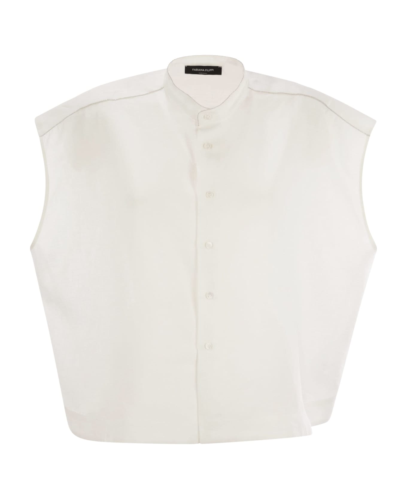 This oversized sleeveless shirt is made of a fresh linen canvas, embellished with diamond thread. Made entirely in Italy using sustainable processes. - Linen canvas - Diamond thread - Sleeveless - Button fastening DESIGNER ID: CAD275F883L377 0142 Composition: 100% Linen Details: Eco brass nikel-free