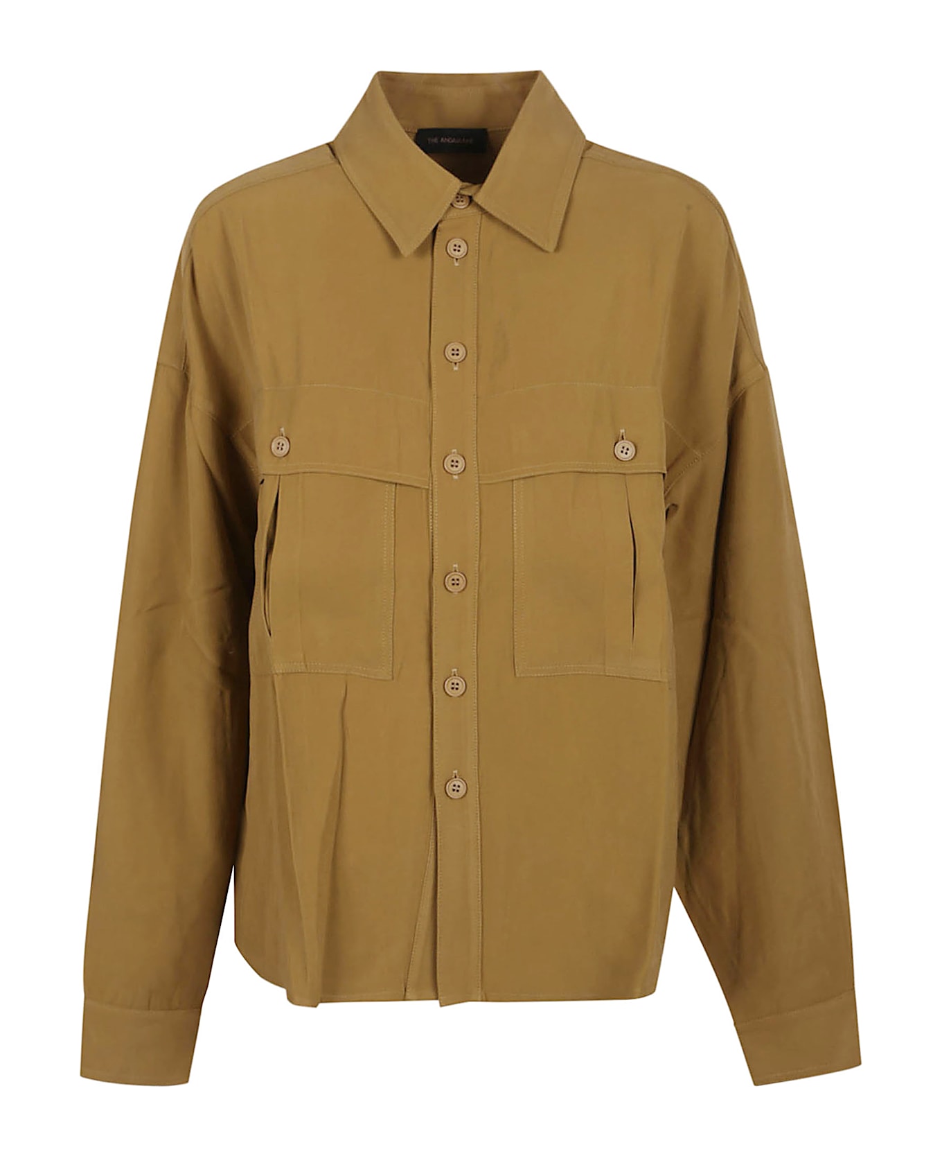 125 / 5. 000 loose mustard yellow shirt button front closure drooped shoulders buttoned cuffs two bellows pockets on the chest