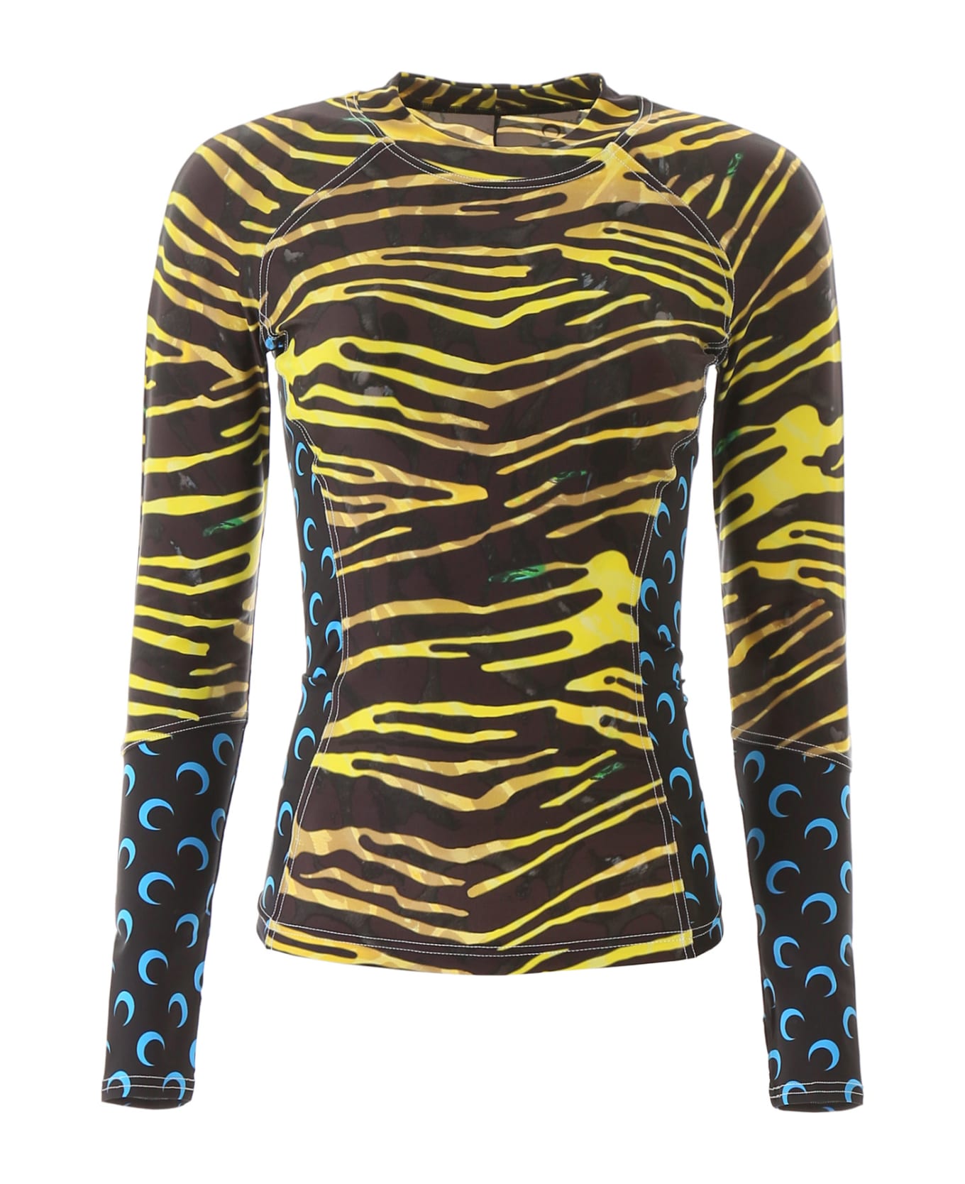 Marine Serre long-sleeved t-shirt in tiger-printed stretch jersey with contrasting side and sleeve inserts featuring a crescent moon motif, symbol of the brand. Contrasting seams, crew neck, thumbhole on the sleeve ends. The model is 177 cm tall and wears a size S.
