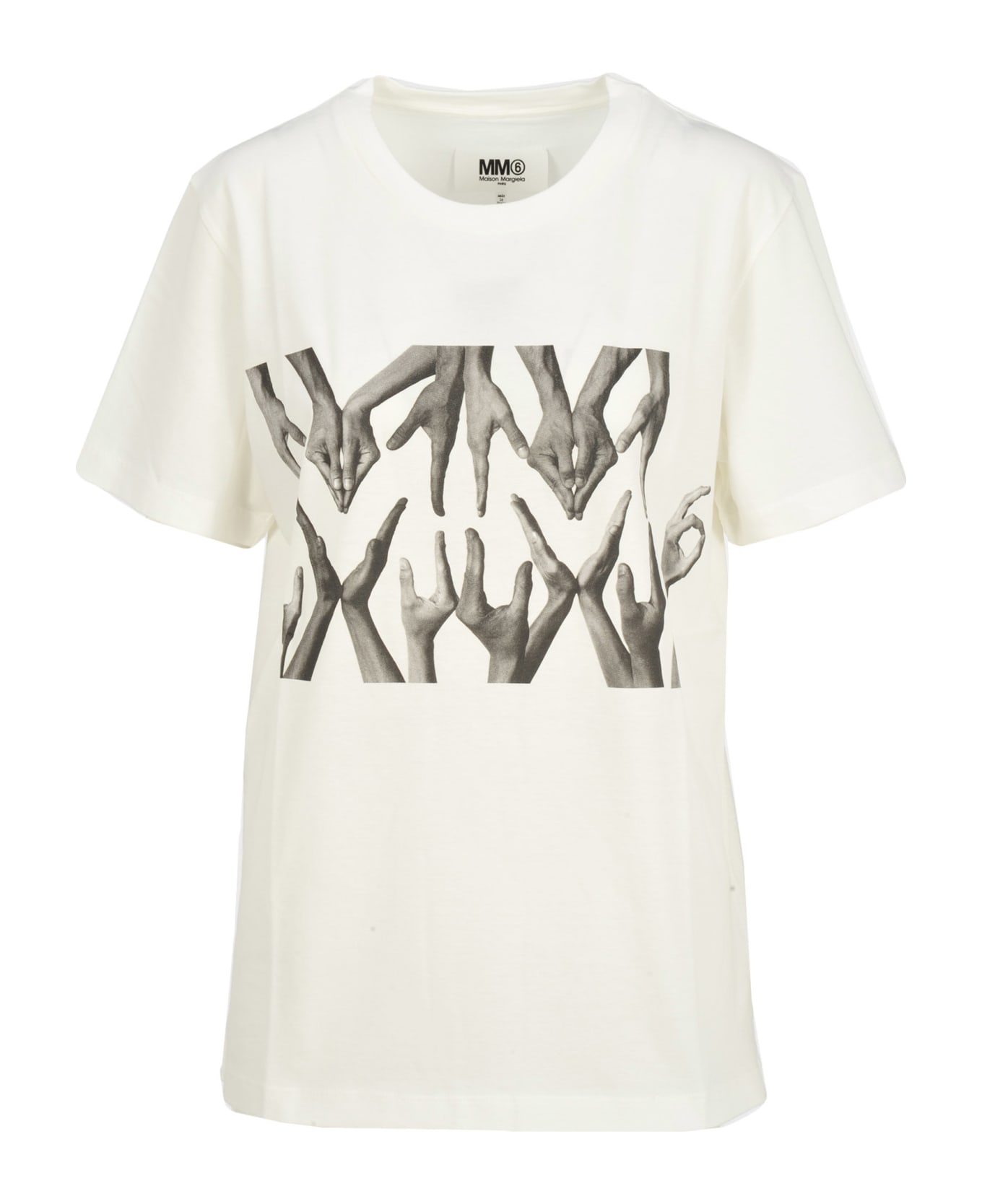 White Cotton Logo Hand Print T-shirt By Mm6. Featuring: