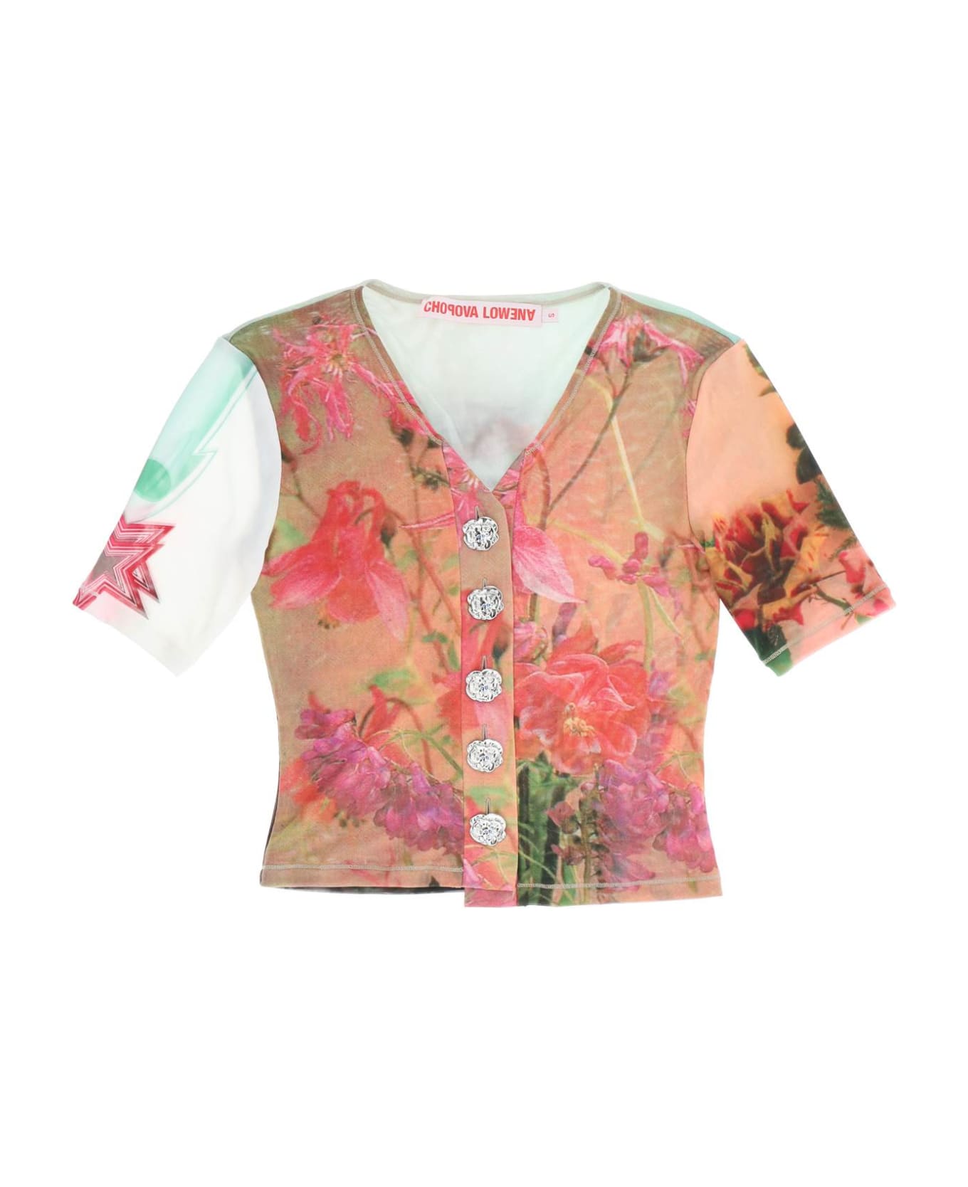 Chopova Lowena short-sleeved top in printed double powermesh, featuring a front closure with flower-shaped buttons with small crystals. Slim fit. The model is 177 cm tall and wears a size S.