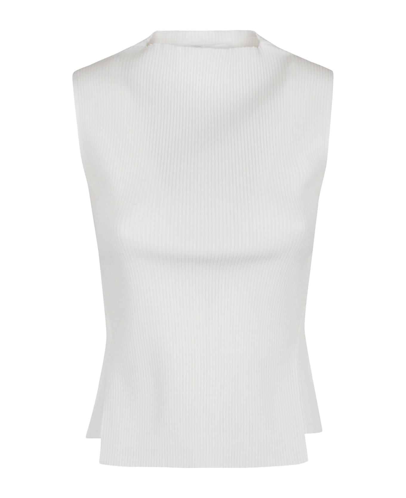 Stretch knit ribbed top with White crew neckline Sleeveless Small short side slits