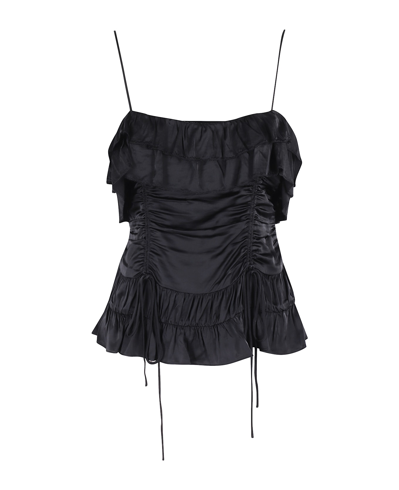 Satin top -Ganni -Black color -Model with rouges -Back zipper closure