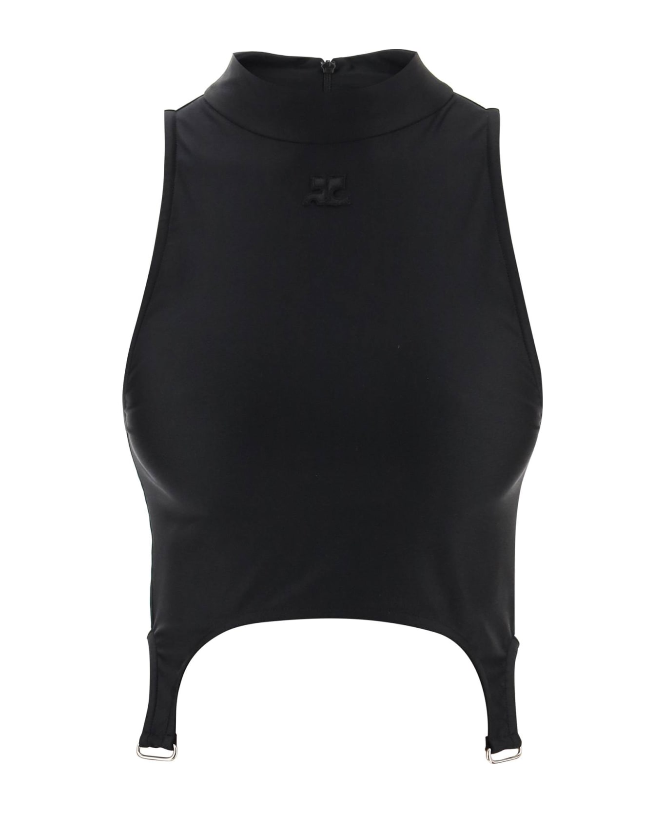 Second-skin top by Courrèges made of stretch techno jersey featuring standing collar, back concealed zip fastening, suspenders with metal ring at the hem. The model is 177 cm tall and wears a size S.