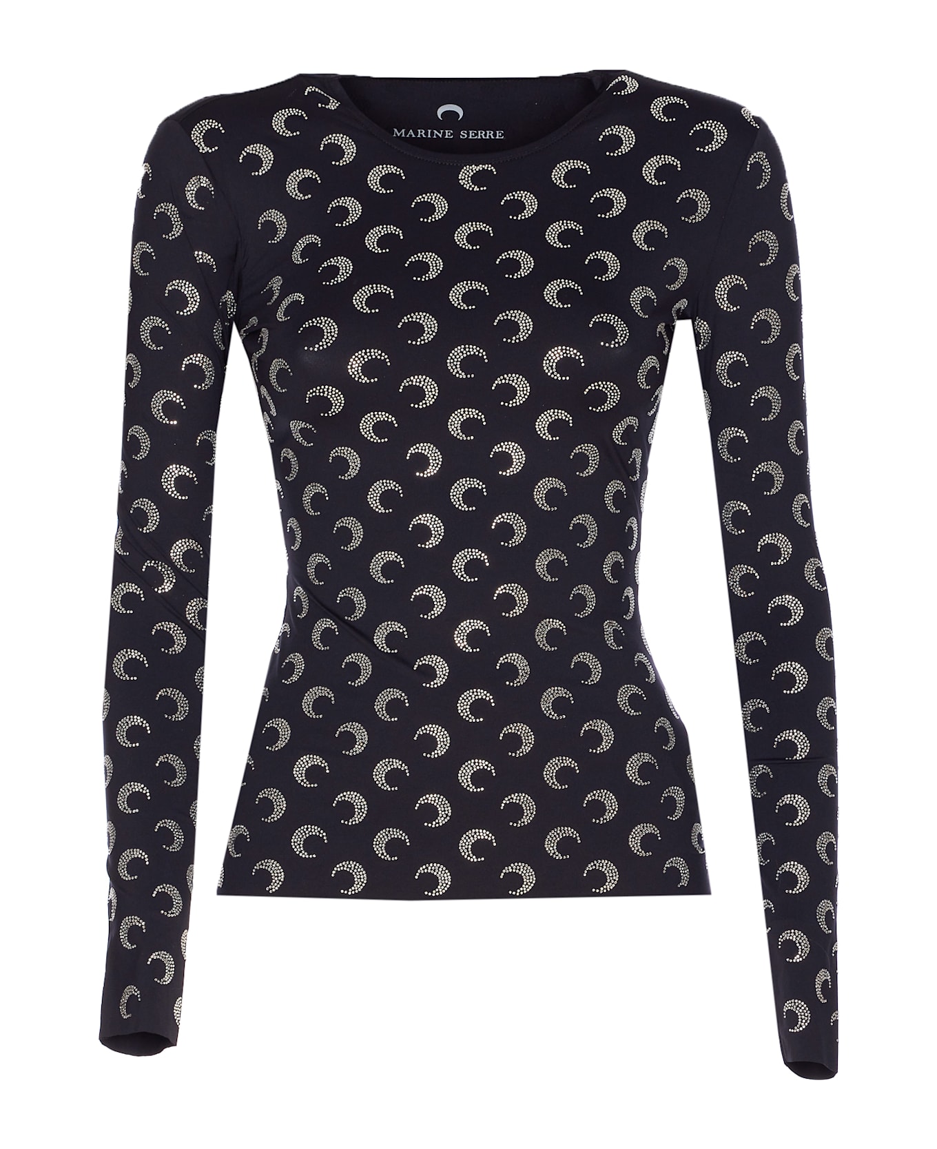 Marine Serre black top, crewneck, all over strass Moon logo, long sleeves, elasticized fit