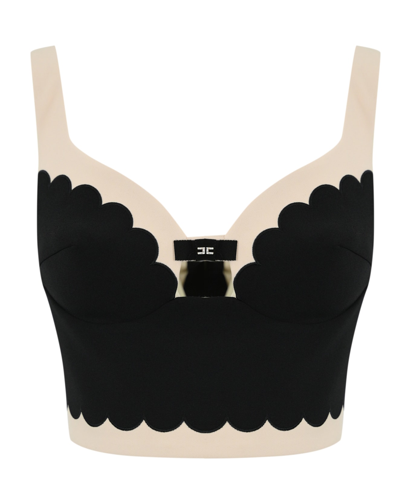 women's crepe top: double stretch crepe sleeveless adjustable shoulder straps sweetheart neckline bow with gold metal logo accessory in the center embroidered scallop zip closure on the back satin lining slim fit composition: 96% polyester, 4% elastane