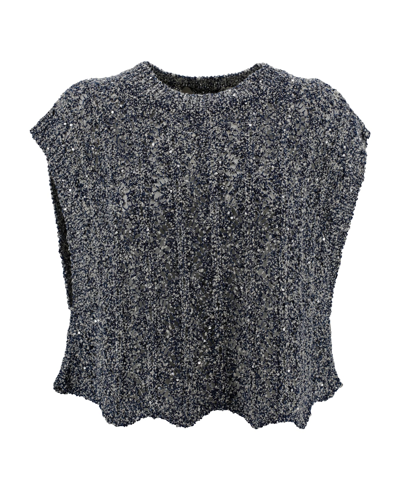 Knitted sequined tank top with a slightly raised ribbed crew neck, featuring slightly dropped shoulders for a soft and modern effect, wavy hem that adds movement. Vertical ribbing throughout the length.