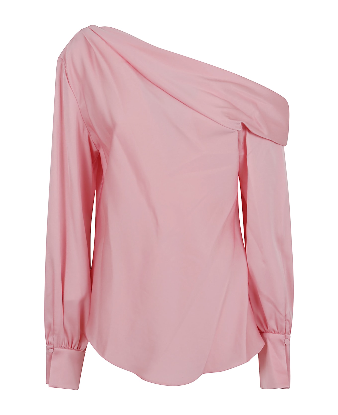 Alice top in shiny satin by JONATHAN SIMKHAI. Long sleeves; buttoned cuffs. Features a draped design and off-the-shoulder styling.