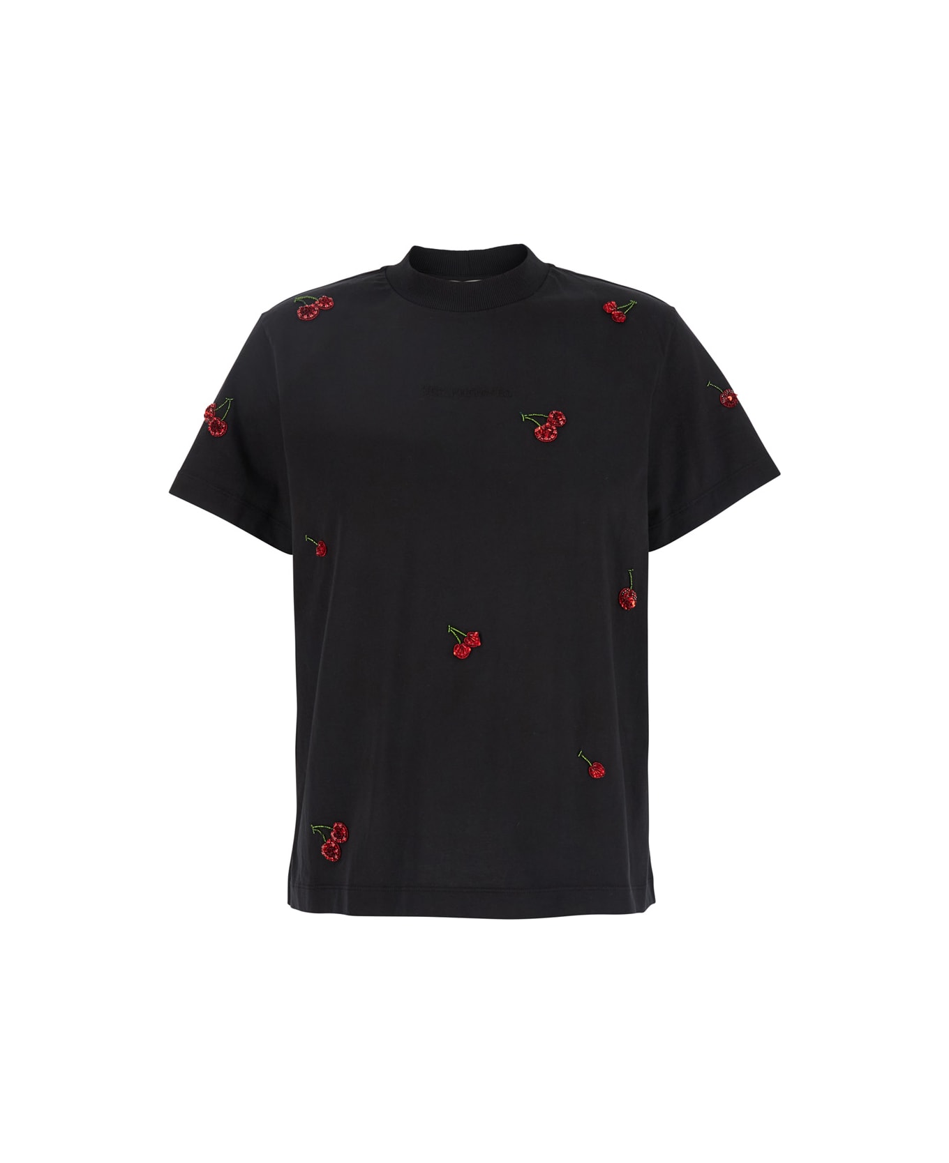 Black T-shirt With All-over Sequined Cherry Decorations In Cotton Woman