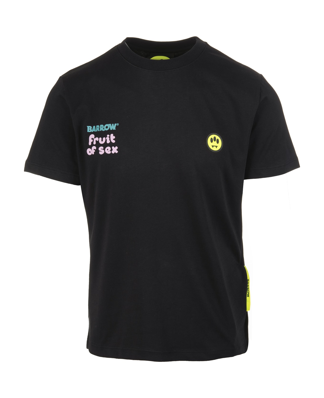 Barrow black t-shirt made of cotton with planet logo screen print on front and back. Model featuring a round neck, short sleeves, a straight hem, a holographic logo to the reverse and a personalized reflective tag to the side. Soft fit for men. Oversized fit for women.