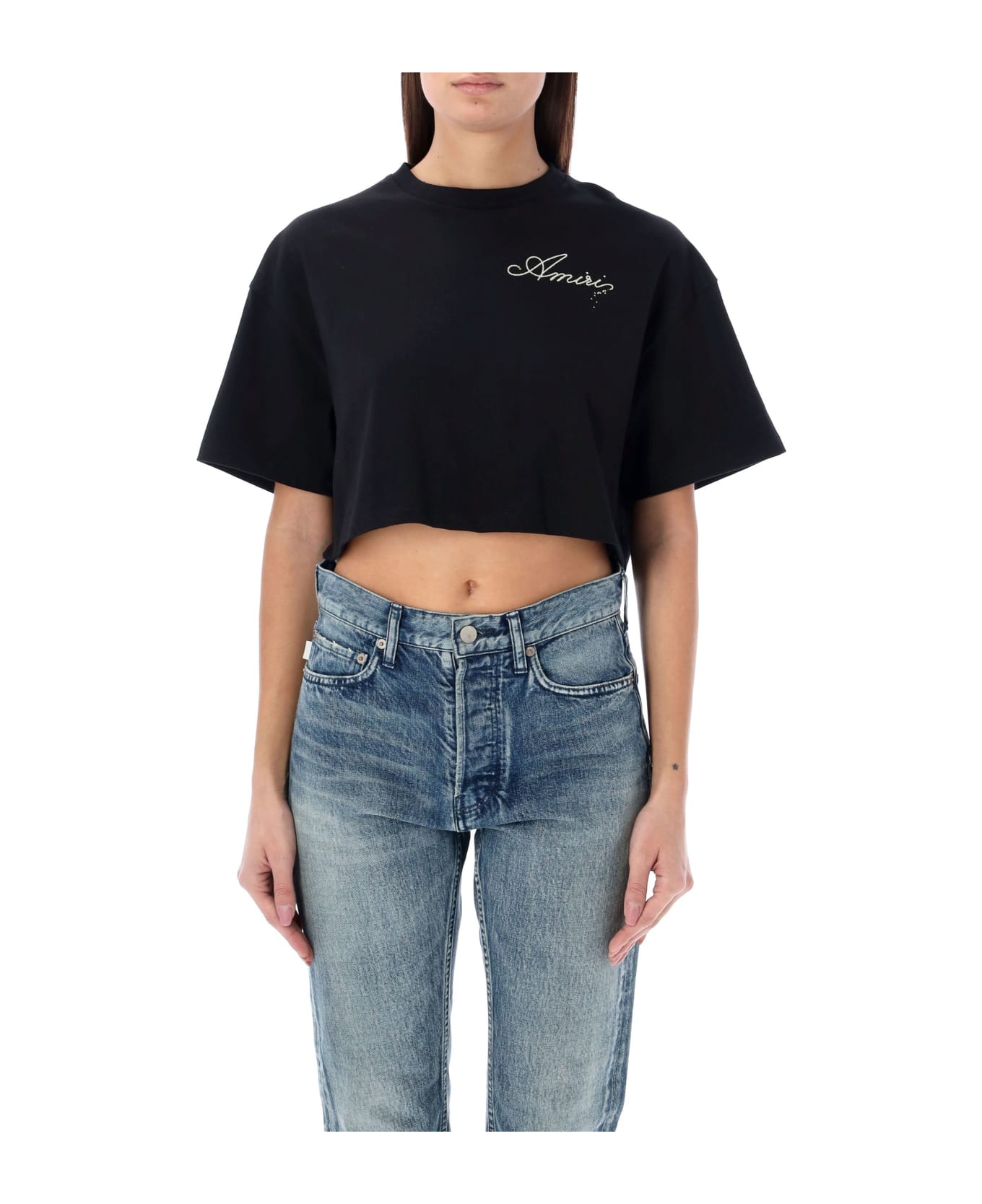 Champagne Tee By Amiri. Featuring: Round Neck Short Sleeves Cropped Logo Print At Chest Champagne Print At Back Model Is 1,72 M Tall And She Is Wearing Size Xs