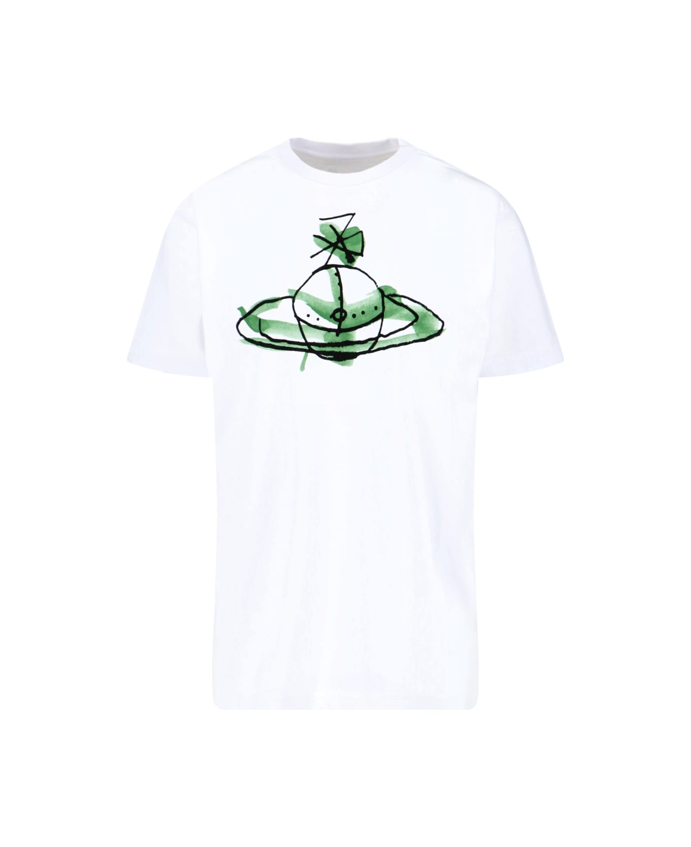 Vivienne Westwood 'Classic' white cotton crew neck t-shirt with short sleeves, green and black 'Drawn Orb' logo print on the chest, straight hem. Composition: 100% Cotton