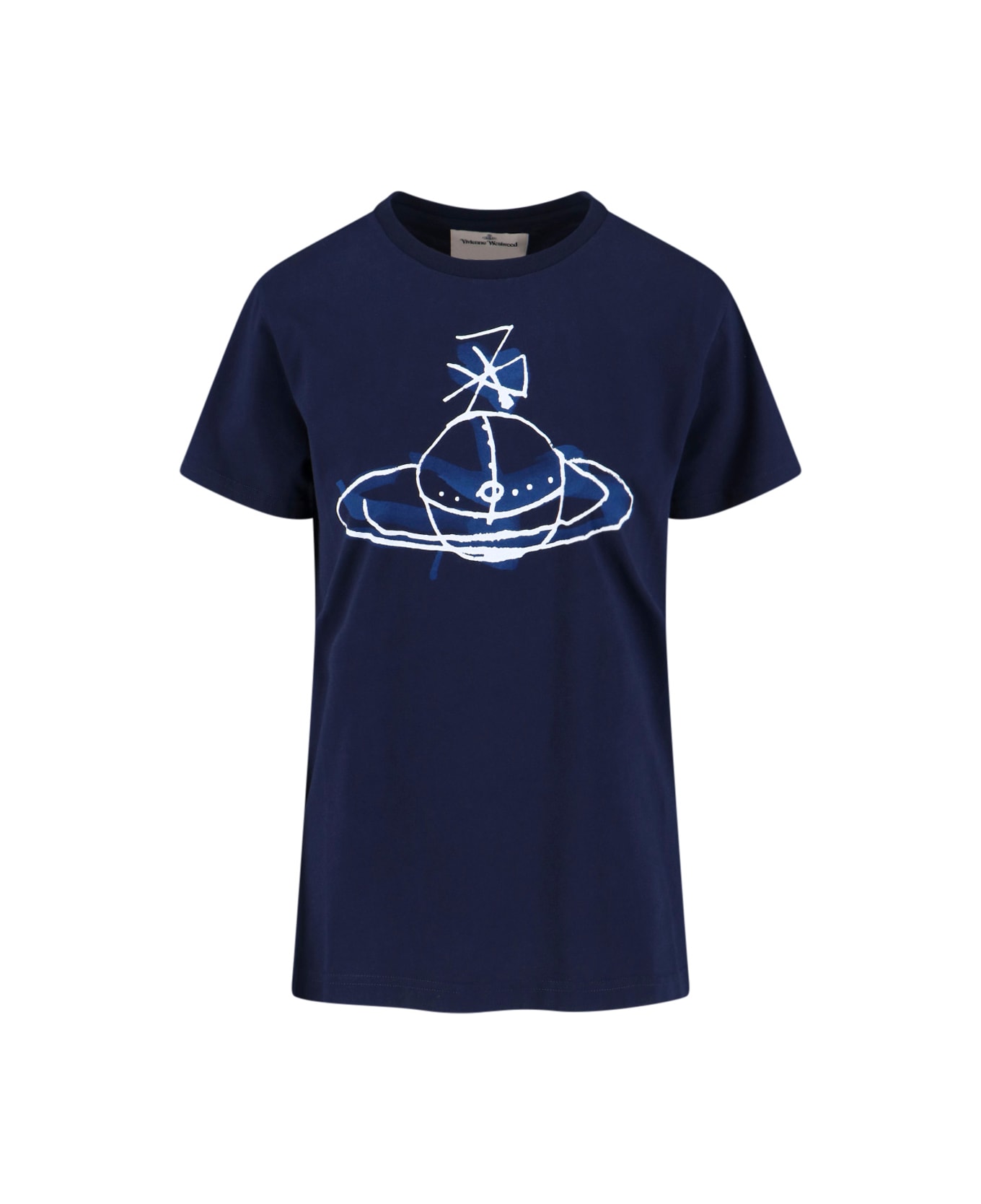 Vivienne Westwood 'Classic' blue cotton crew neck t-shirt with short sleeves, white and blue 'Drawn Orb' logo print on the chest, straight hem. Composition: 100% Cotton