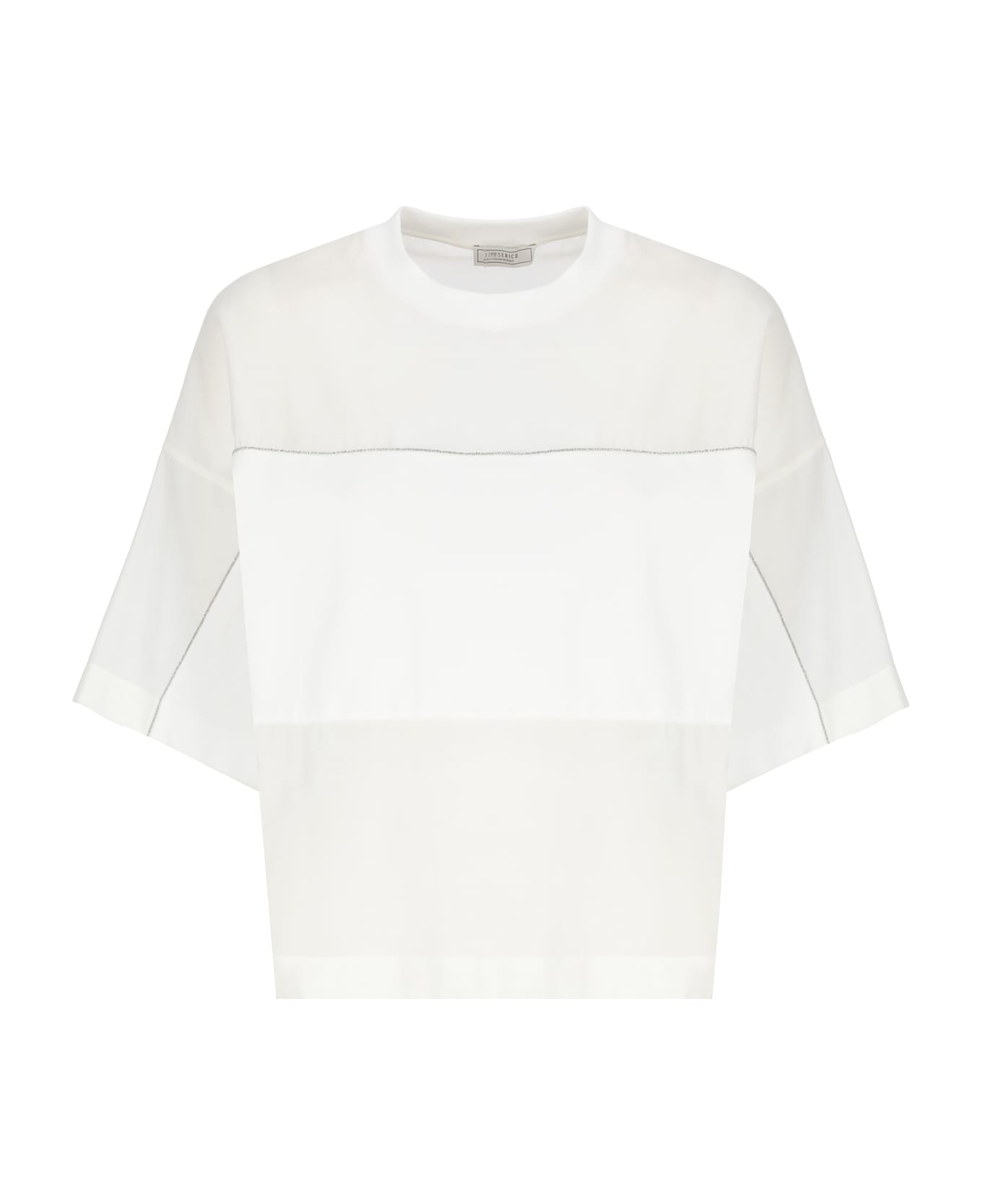 - White Peserico cotton and silk t-shirt for woman - Round neck - Shorts sleeves - Front bright light point detail Composition: 65% Cotton, 35% Silk Fabric 2:, 95% Cotton, 5% Elastane