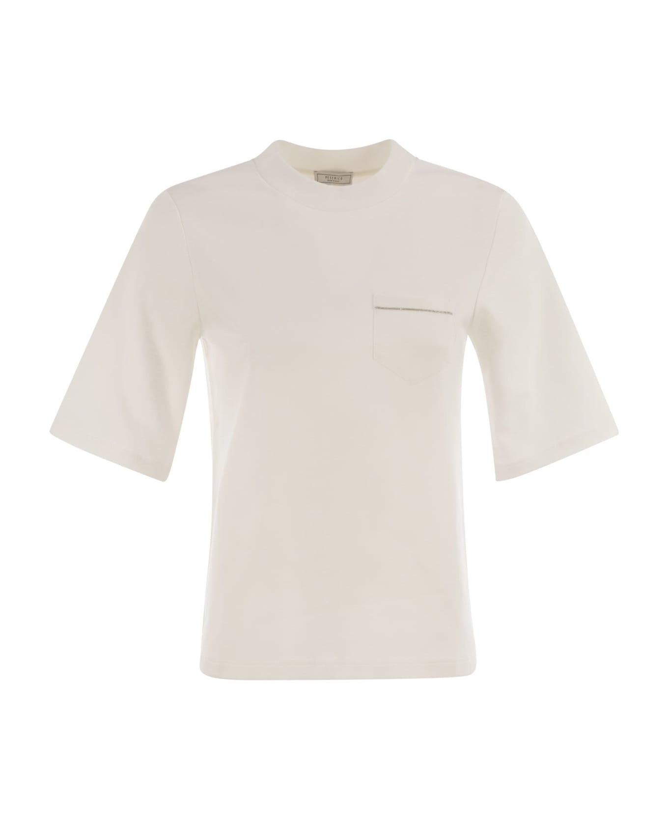Made of cotton-blend jersey, this practical and comfortable T-shirt is characterised by its discreet elegance. The regular fit makes it suitable for different silhouettes, while the Punto Luce detail on the pocket gives it a distinctive detail. This T-shirt is perfect to pair with tailored trousers, midi skirts or jeans for contemporary and versatile looks. - T-Shirt with fitted 3/4 sleeves - Round neckline - Light stitch on patch pocket - Regular fit DESIGNER ID: S06296J005635 502