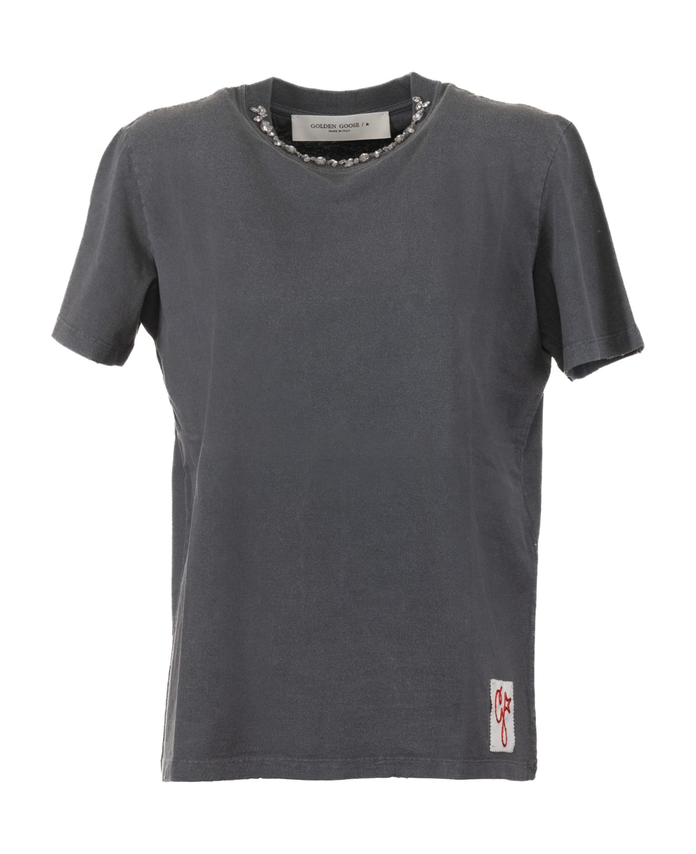 Grey regulat t-shirt with crystals on neck and embroidered logo on side from Golden Goose. - fit the true size - composition: 100% cotton - made in italy