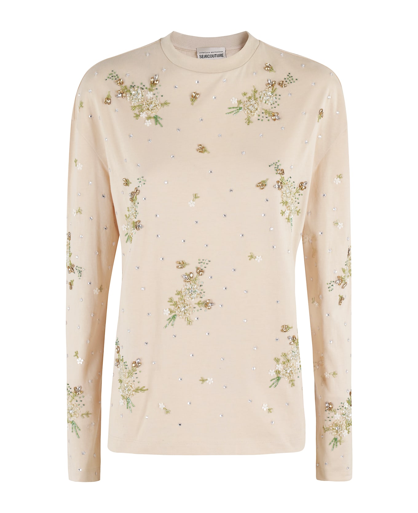 Heidei T-Shirt - Semicouture - Soy color - Crew neck - Long sleeve with dropped shoulder - All-over beaded floral embroidery - Loose fit