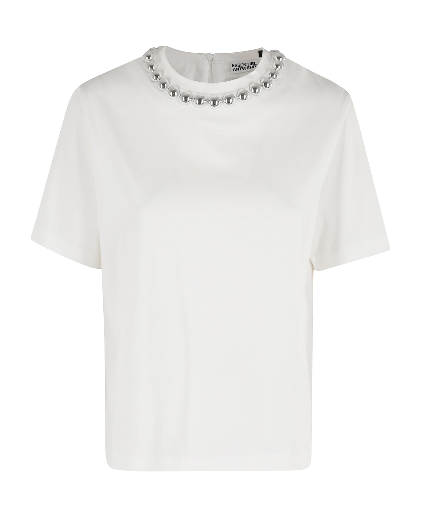 T-shirt - Essentiel Antwerp - Intense silver balls pattern - Off white color - Short sleeves - Crew neck with pearl applique - Back zipper closure