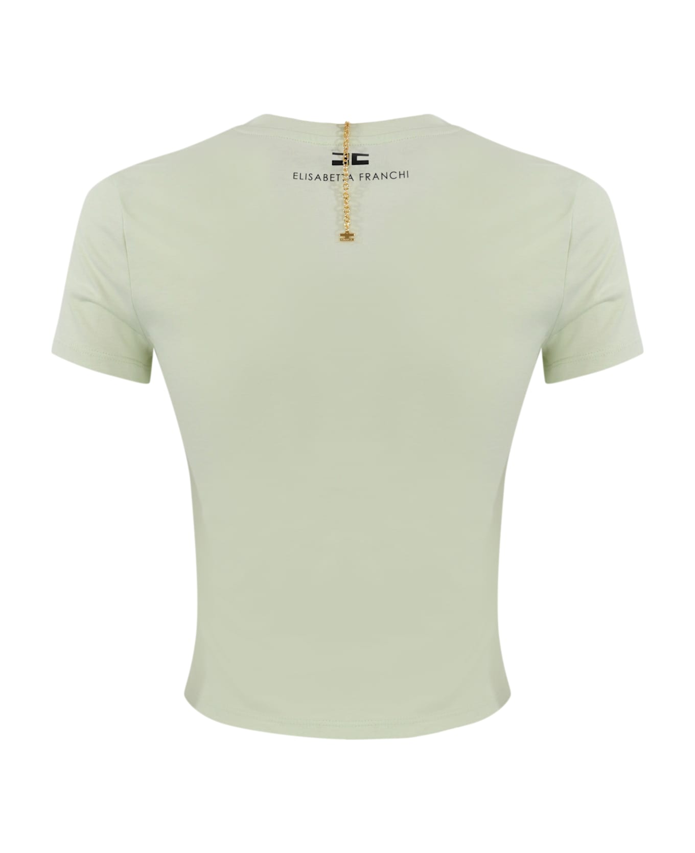 women's cotton t-shirt: cotton jersey short sleeves crew neck cropped at the waist curling at the bottom removable golden metal necklace with logo charms and bow logo print on the back slim fit composition: 100% cotton