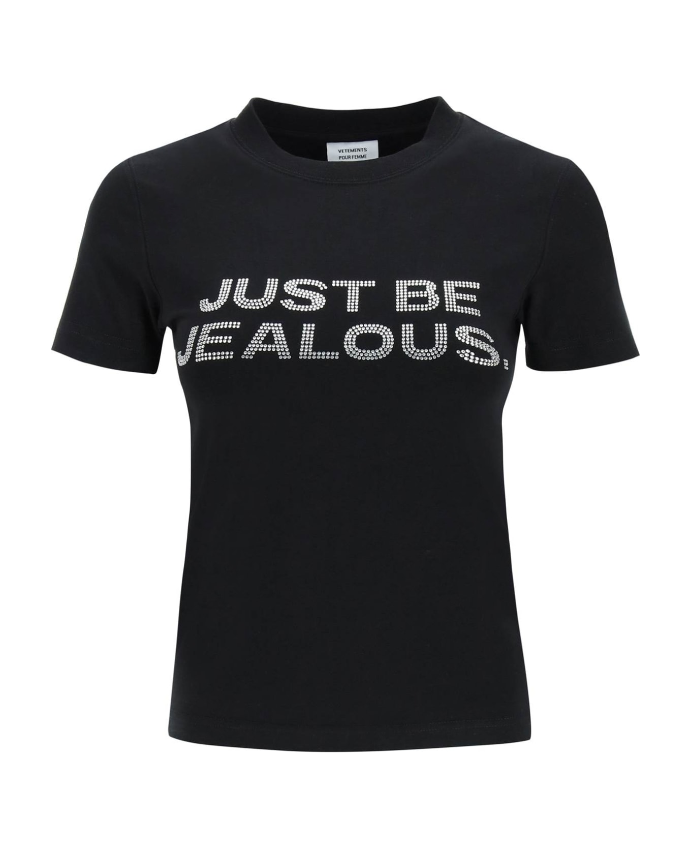 Short-sleeved fitted stretch cotton jersey t-shirt by Vetements, personalized by the Just Be Jealous rhinestone lettering on the front. Ribbed finished crew neck. The model is 177 cm tall and wears a size XS. Composition: 97% CO, 3% EA