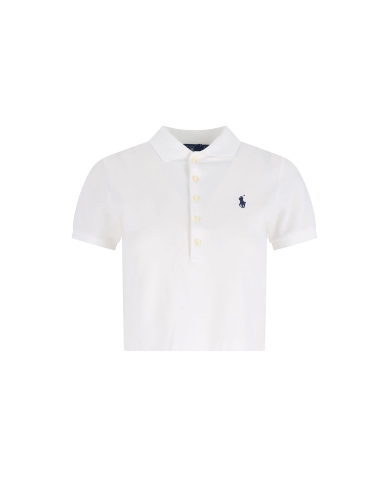 Polo Ralph Lauren logo crop polo shirt in white cotton with classic collar, button closure, blue logo embroidery on the front, straight hem.