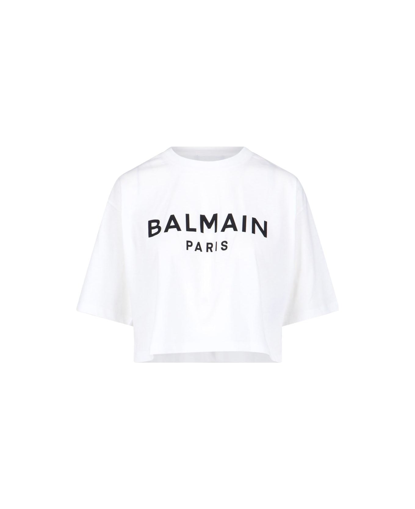 Balmain white cotton, crewneck t-shirt with short sleeves, a black logo print at the front and a straight hem.