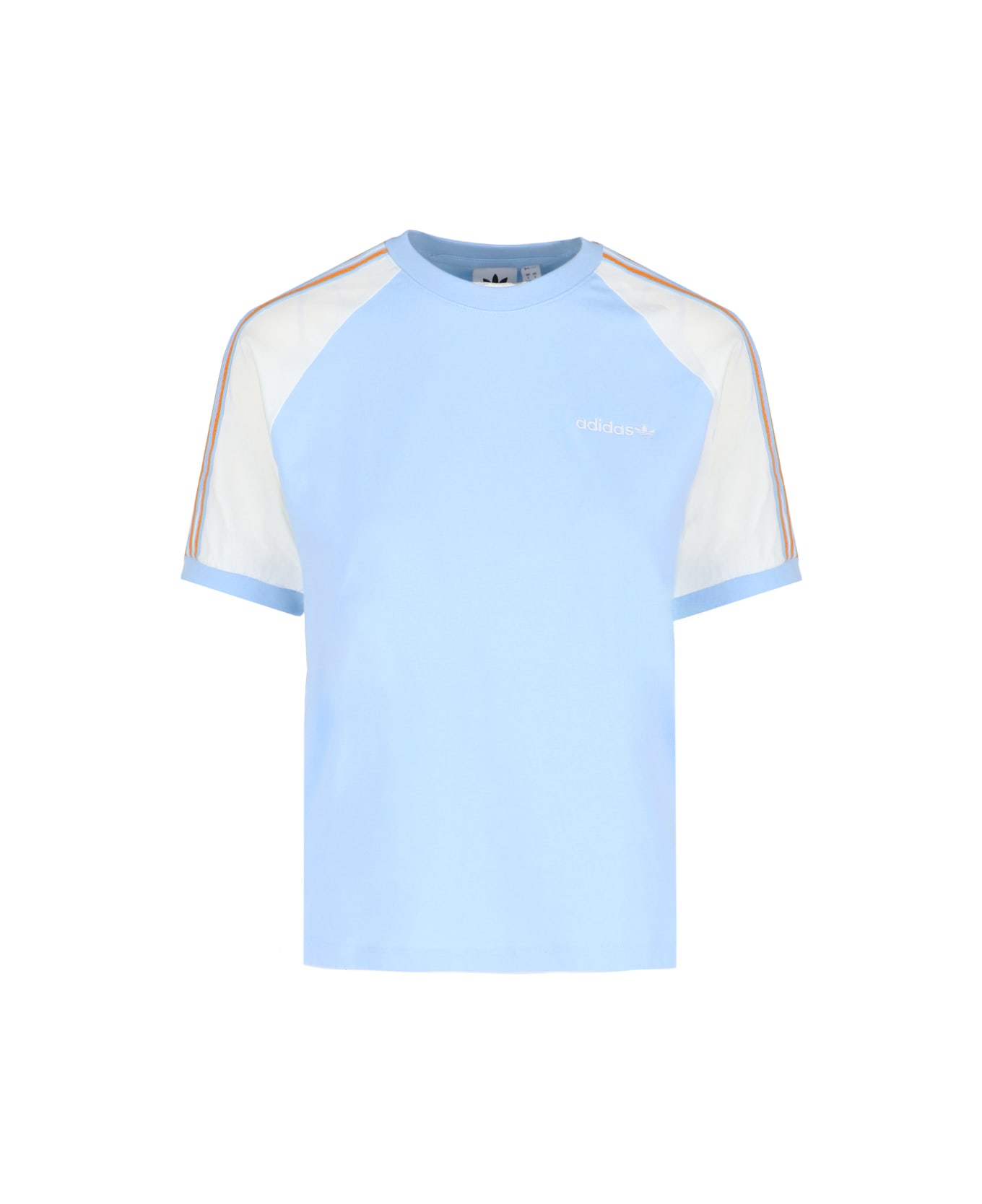 Adidas logo T-shirt "80s" in light blue cotton, white and yellow details, crew neck, short raglan sleeves, logo embroidery on the front, ribbed trims, straight hem. Composition: 100% Cotton