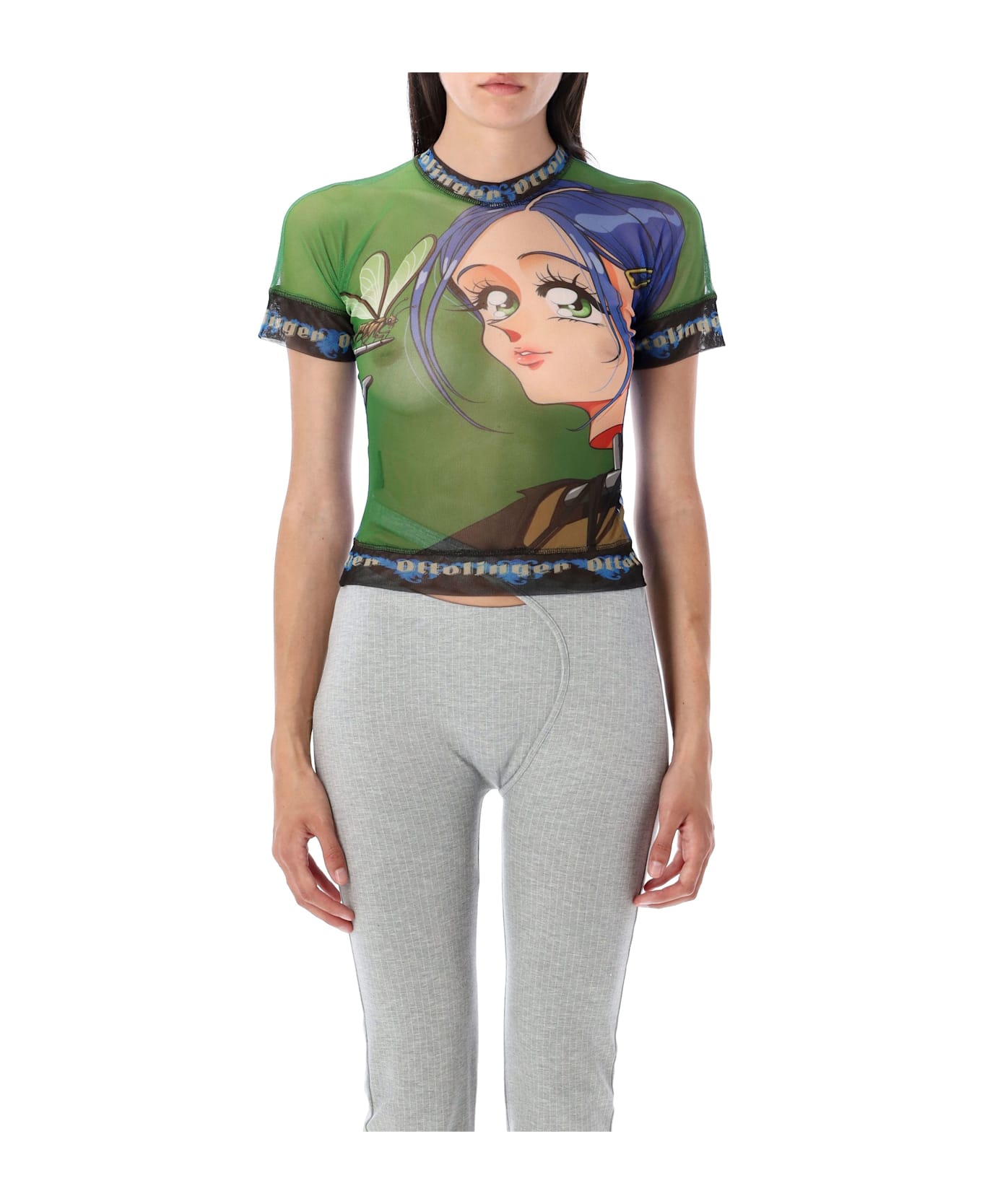 Mesh T-shirt By Ottolinger. Featuring: Crew Neck Short Sleeves Multicolor Manga Motif Print All-over Logo Print At Collar, Cuffs And Hem Slightly Cropped Slim Fit Model Is 1,70 M And Wears Size S