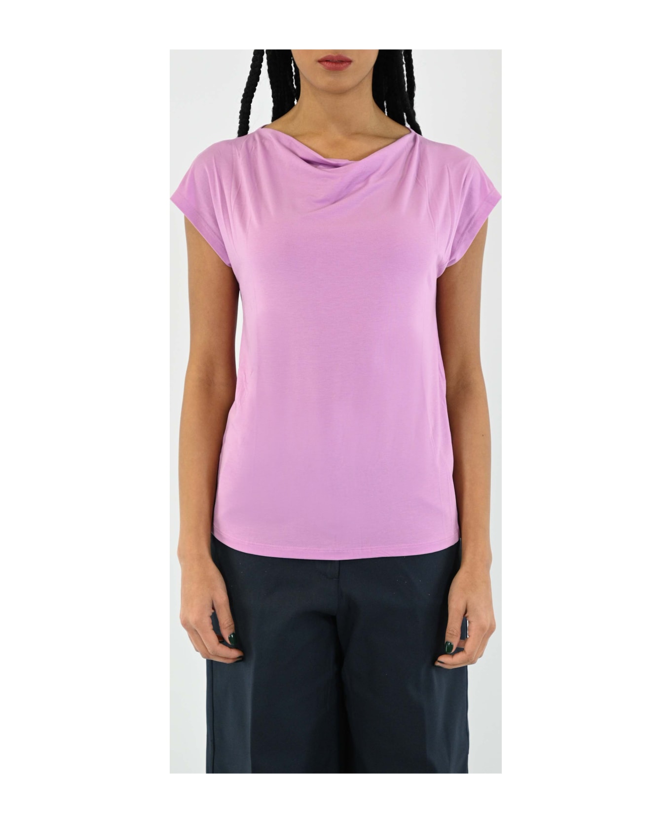 relaxed-fitting lyocell and stretch cotton jersey t-shirt. slightly draped neckline and short sleeves. composition and washing 63% lyocell, 30% cotton, 7% elastane. in the washing machine max 30 degrees reduced mechanical action; do not bleach; do not tumble dry; dry flat in the shade; lukewarm iron max 110 degrees c; delicate dry cleaning with perchlorethylene; very gently, professionally, wet wash. ; use a cloth between the garment and the iron. ; use neutral detergent. ; turn garment inside out before washing. ; iron inside out.