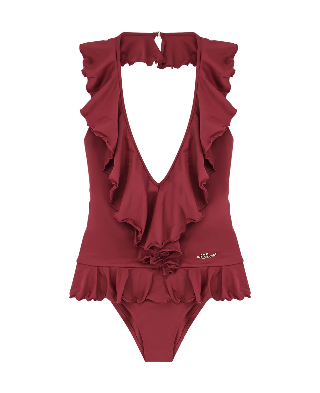SKU: 25UMB19473_611 - Closure with metal hook on the back v-neckline with volant logo gold metal detail made in italy 82% recycled polyamide 18% elastane