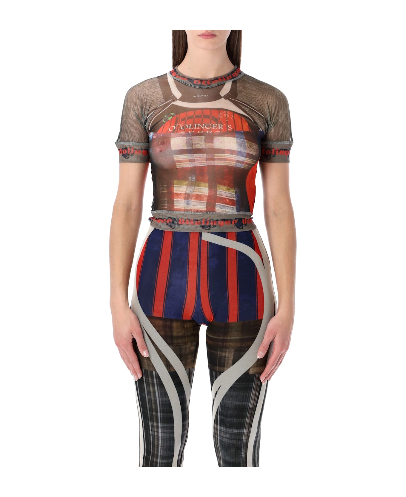 The Ottolinger Mesh T-shirt Is A Semi-sheer Mesh Top Featuring A Multicolored Racing-plaid Print, Embodying The Brand s Experimental And Futuristic Aesthetic. Its Fitted Silhouette Enhances The Body s Shape, While The All-over Graphic And Technical Detailing Create A Bold, Statement-making Look. Perfect Worn On Its Own Or Layered For Added Visual Impact. Semi-sheer Mesh T-shirt