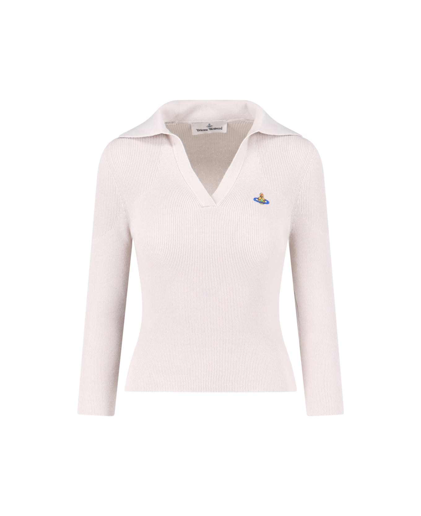 Vivienne Westwood 'Marina' polo shirt in cream cotton and cashmere with ribbed pattern, V-neck, long sleeves, multicolor 'Orb' logo embroidery on the chest, straight hem. Composition: 85% Cotton, 15% Cashmere