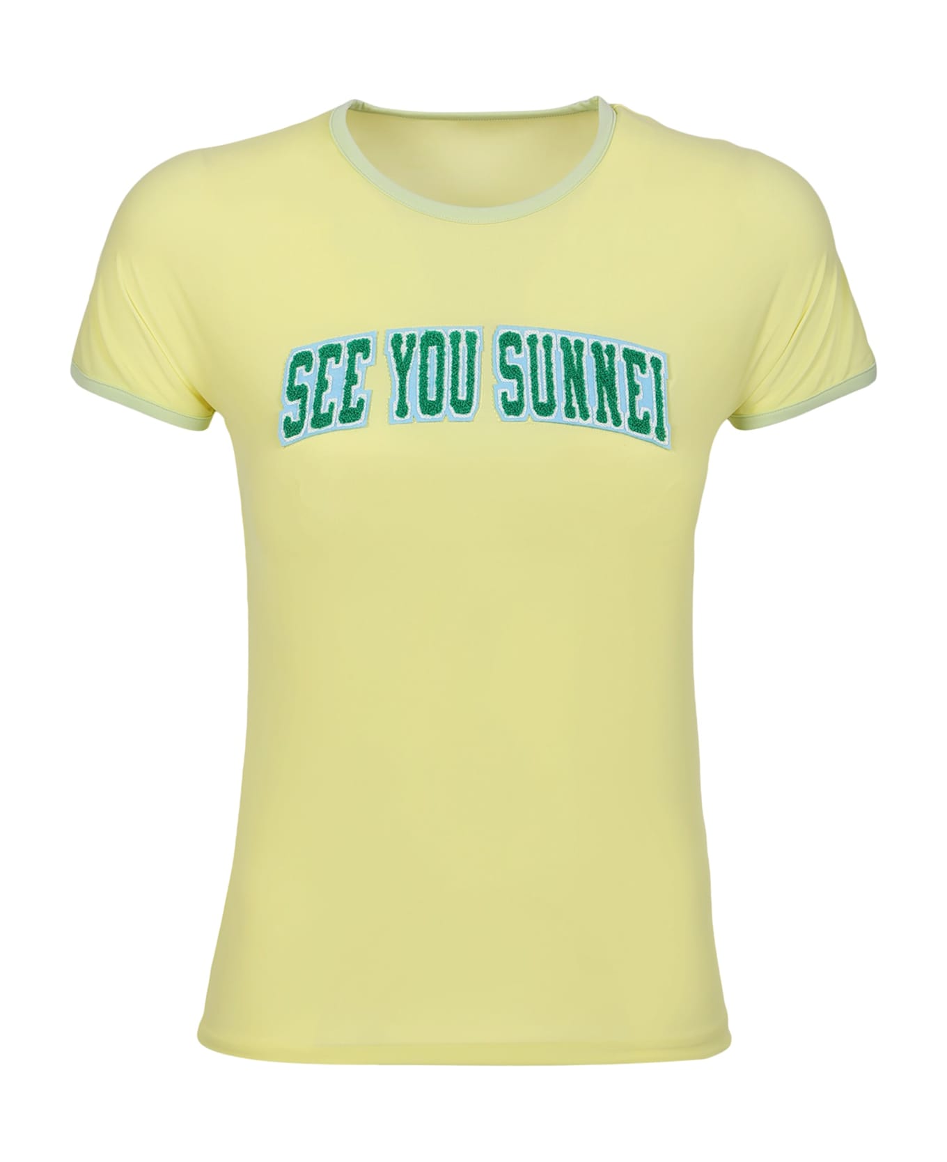 Roundneck. Short sleeves. Slogan patch to the front. Fleece texture. Straight hem. Color: light yellow/ green