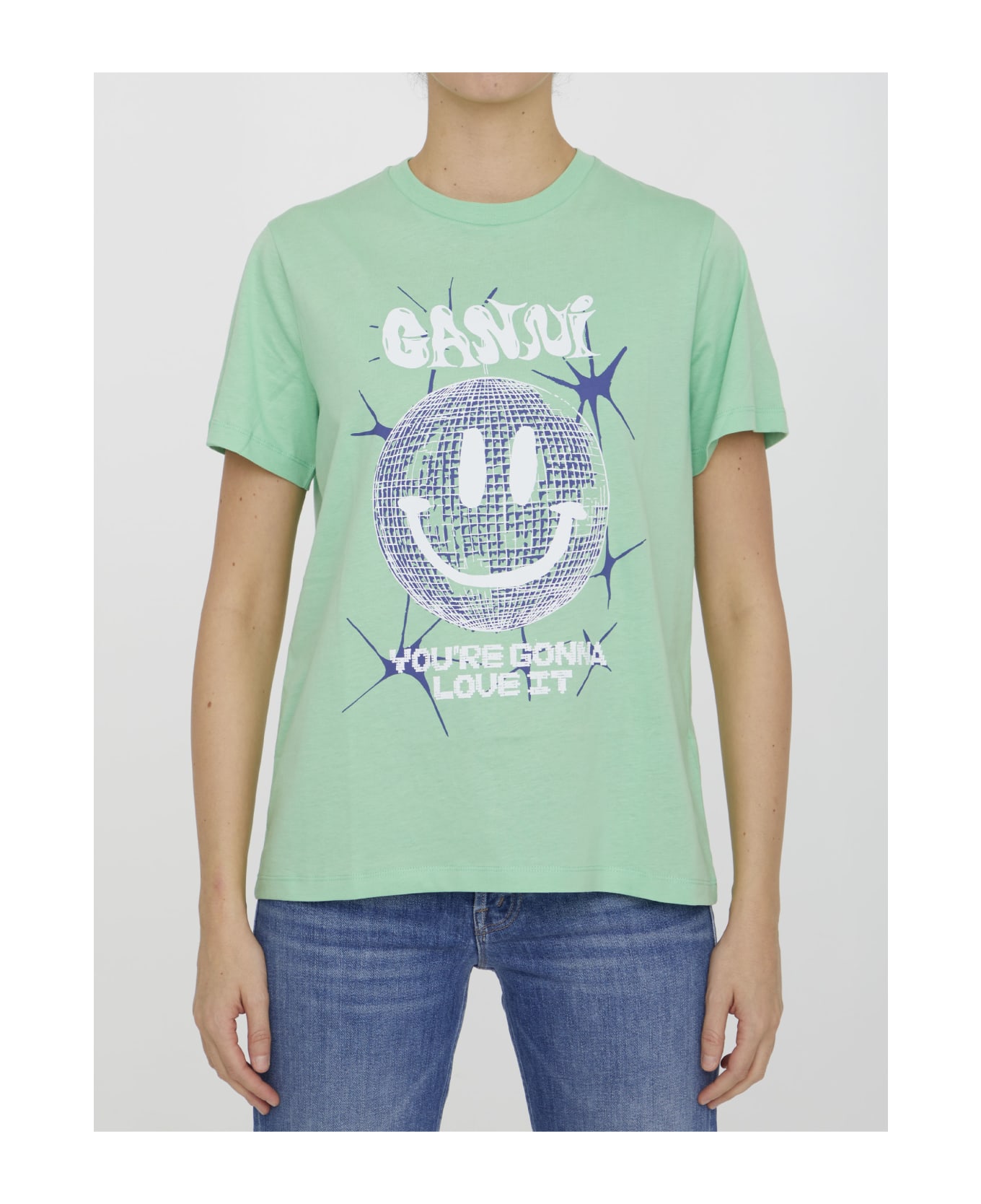 Short-sleeved crewneck t-shirt in green cotton with contrasting Smiley print on the front. Relaxed fit. The model is 178cm tall and wears size XS.