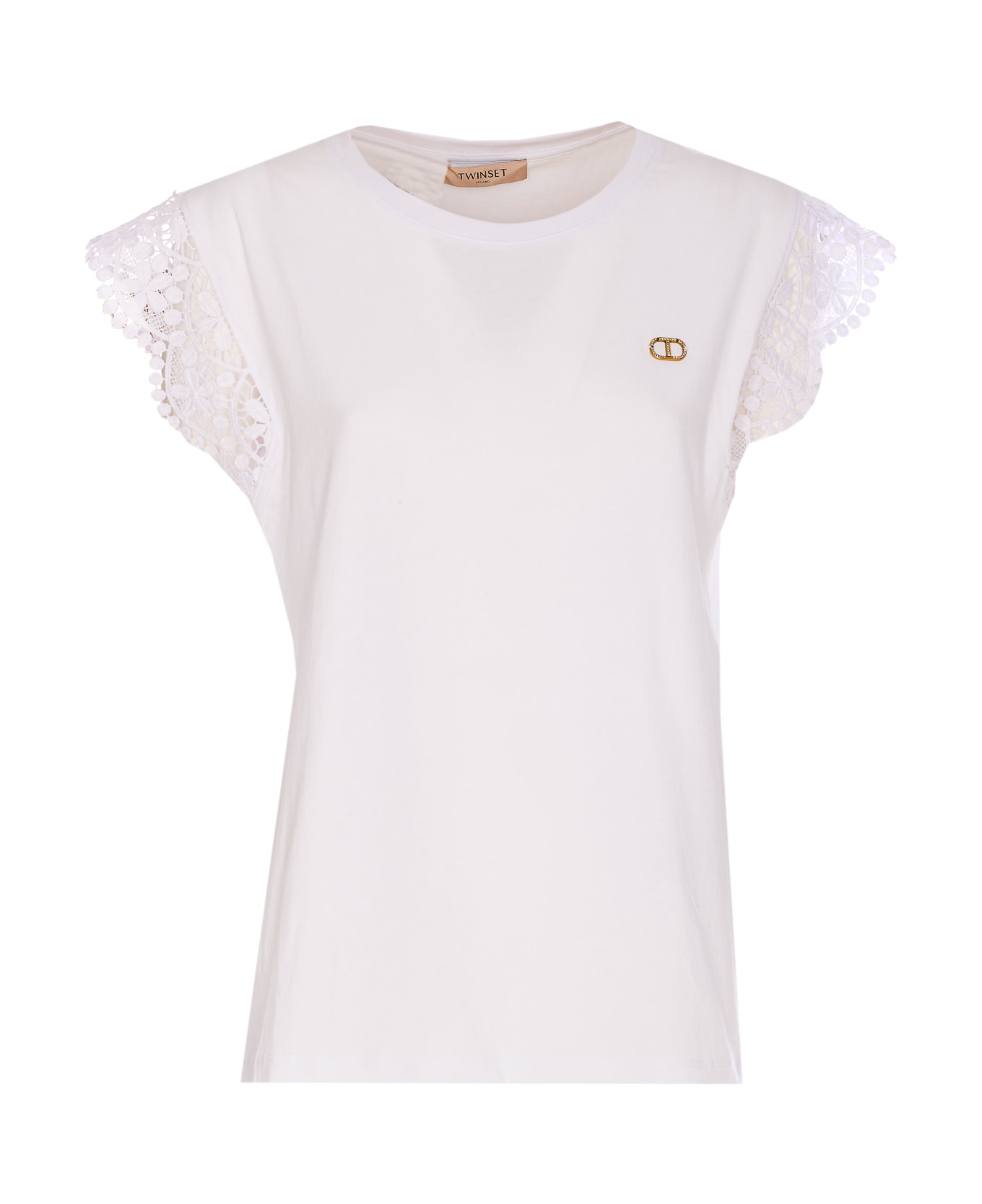 Twinset white t-shirt, crewneck, embroidered on sleeves, plaque logo on the front