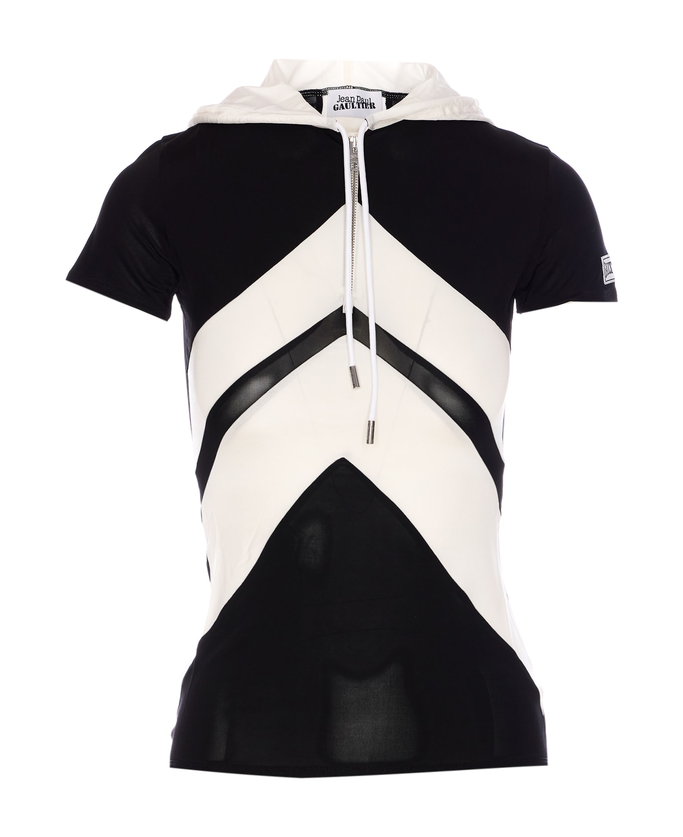 Jean Paul Gaultier black and white t-shirt, zip detail on the frotn, hood with coulisse detai, tight fit