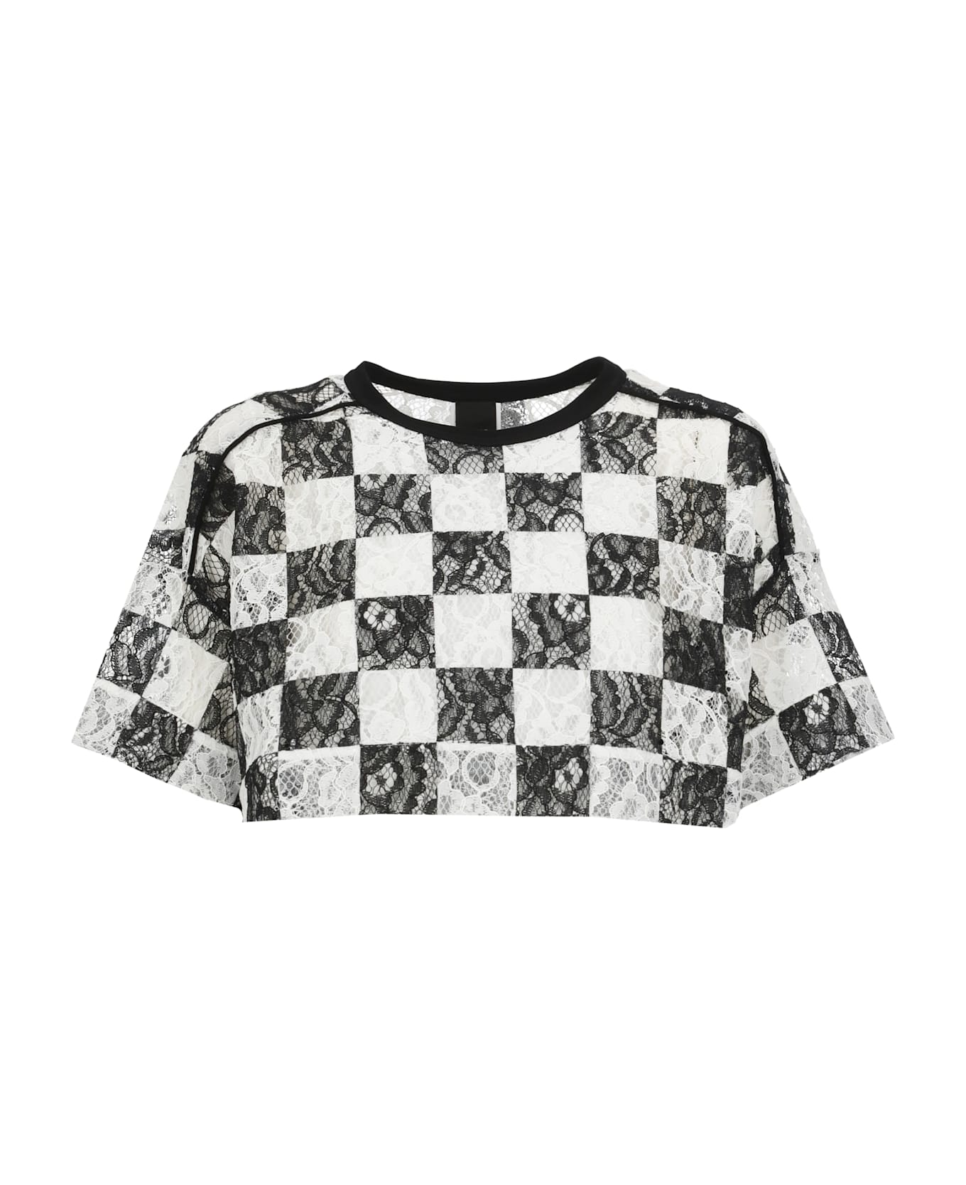 - Black Pinko t-shirt for woman - Round neck - Short sleeves - All-over check pattern - All-over lace pattern