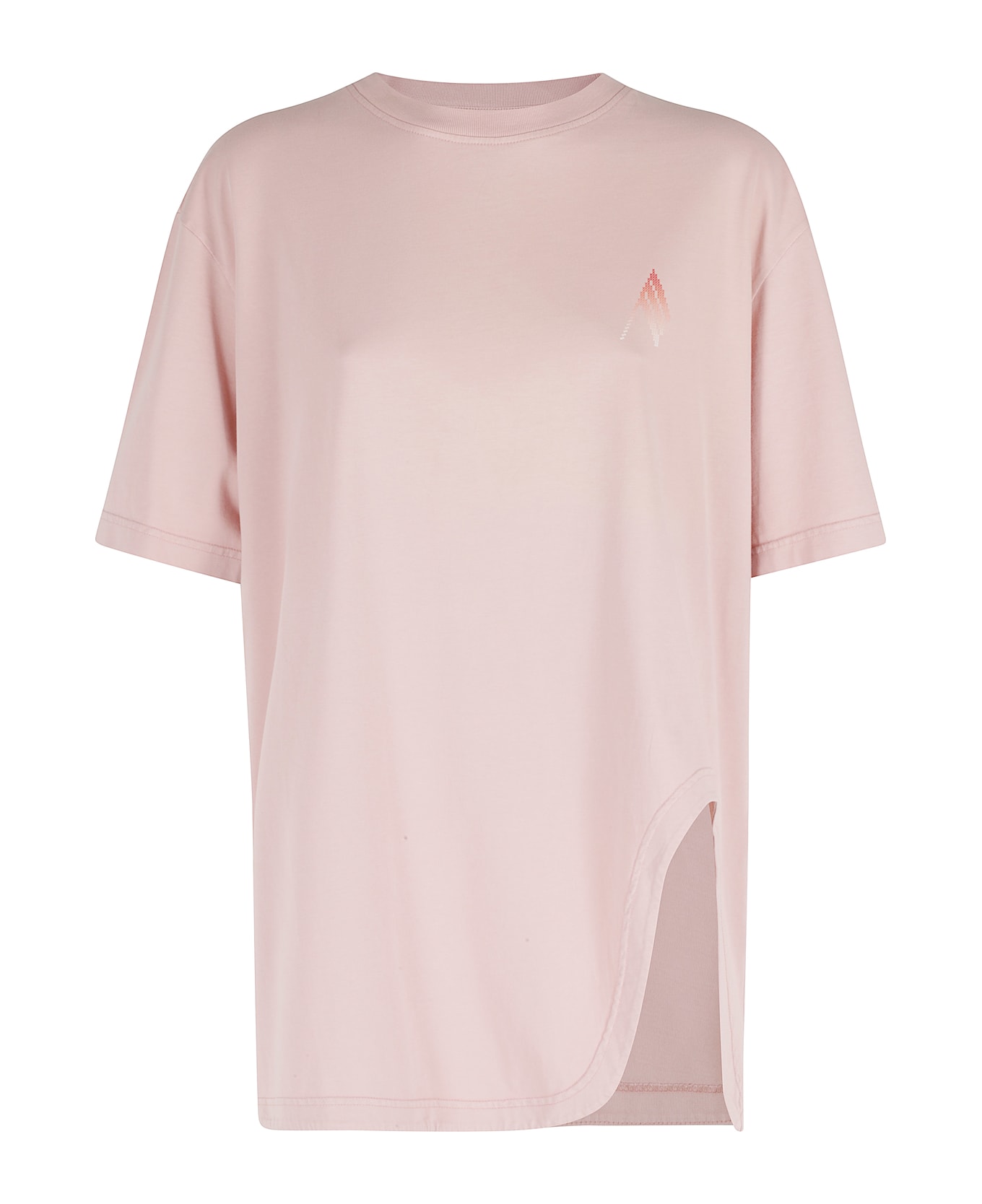 Category: T-shirt Item: T-shirt Brand: The attic Color: Pink Neckline: Crew Neck Details: Soft side slit, back graphic SIZE AND FIT Fit: Oversize Fit: Oversize Line: Straight Length: Long Sleeve Length: Short