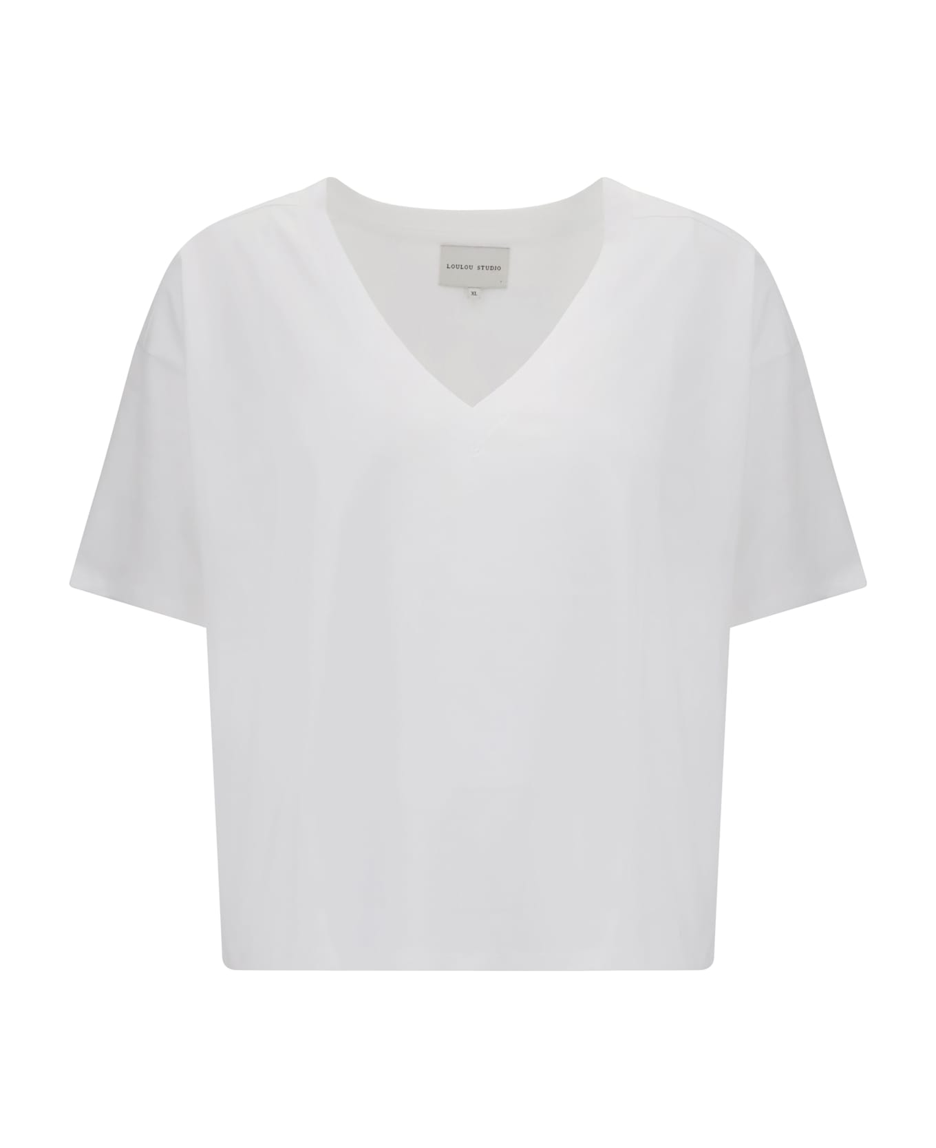 Loulou de saison's cotton t-shirt is a versatile garment that combines comfort and style. featuring a v-neck on the front and an asymmetrical hemline, it offers a modern and dynamic silhouette. perfect for a casual yet sophisticated look, it can be easily paired with a variety of outfits for a touch of casual elegance.