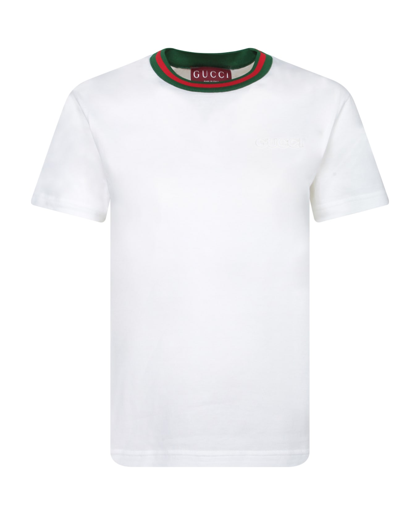 A celebration of luxury and Italian design, this pristine white Gucci T-Shirt is embellished with an iconic green and red Web collar and a discreet tonal logo. Composition: 100% Cotton