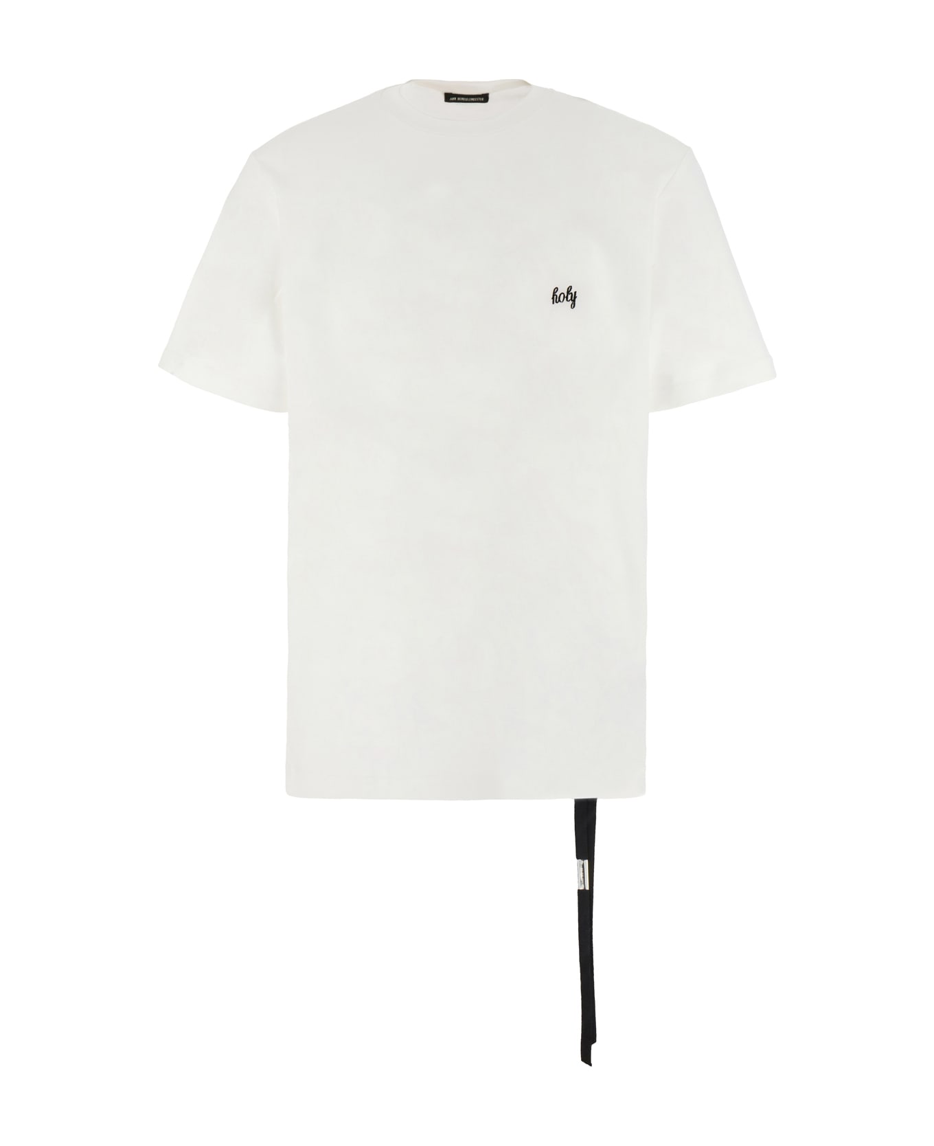T-shirt realized in pure cotton characterized by peculiar contrasting embroidery on the chest enriched by detachable tonal fabric insert on the hemline. -Ribbed crew-neck
