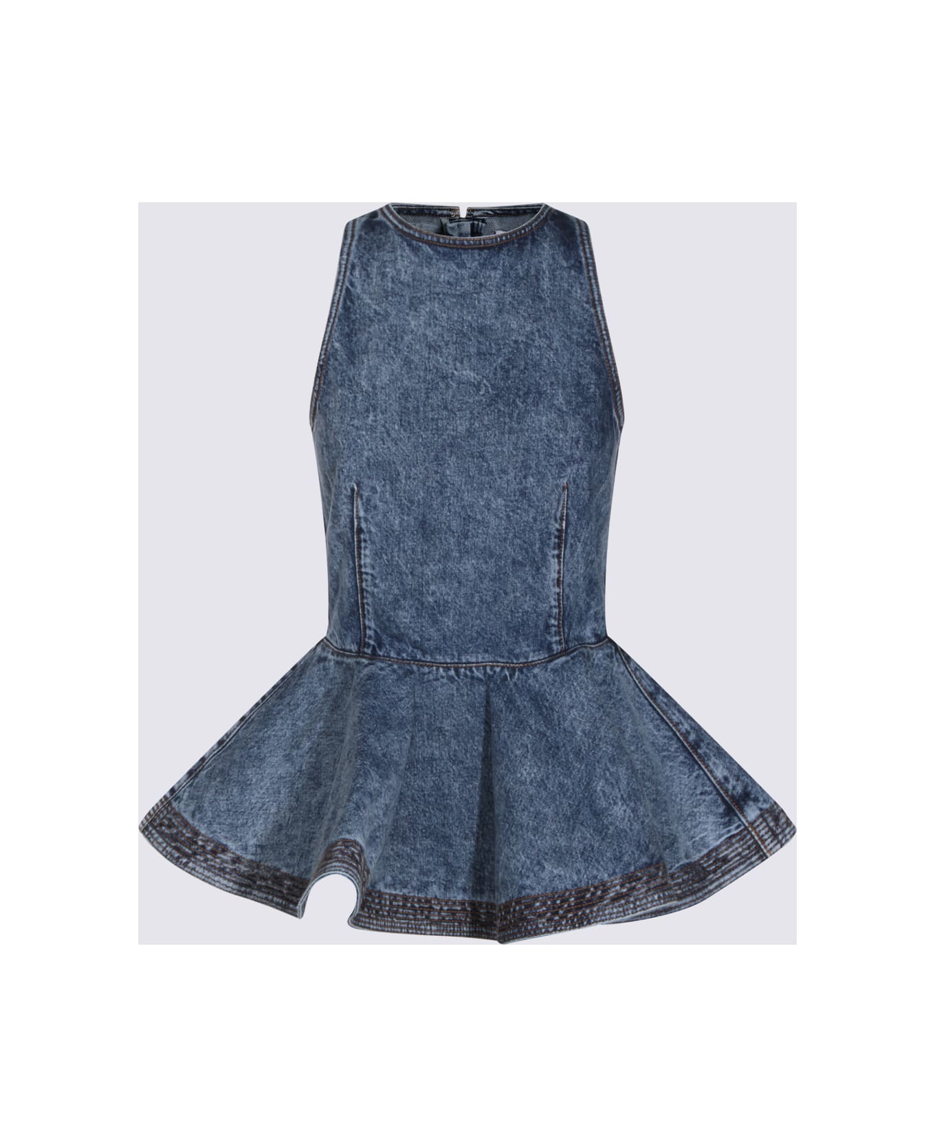 Blue denim cotton top from Alaia featuring round collar, sleeveless, back zip fastening and flared hem.