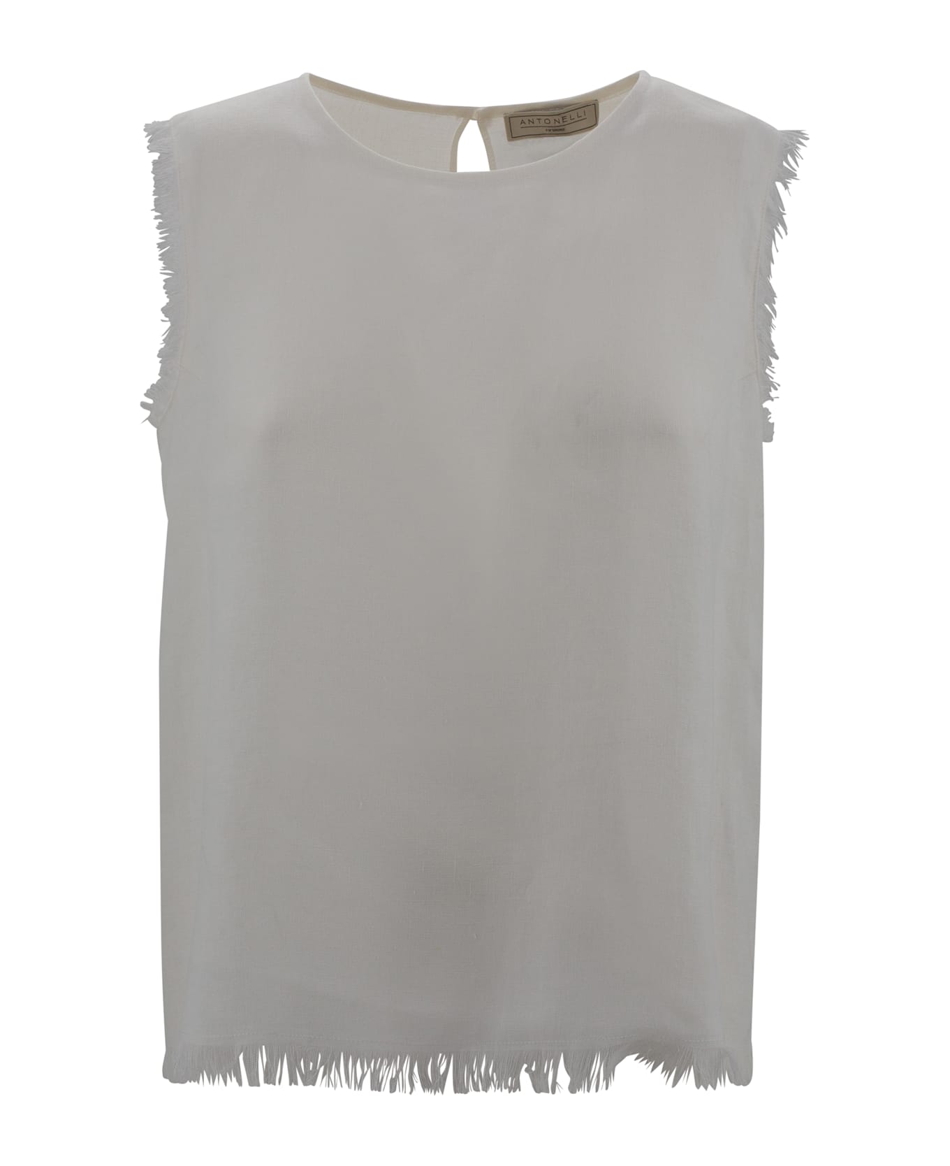Linen-blend, sleeveless tank top with frayed edges and crew neck.