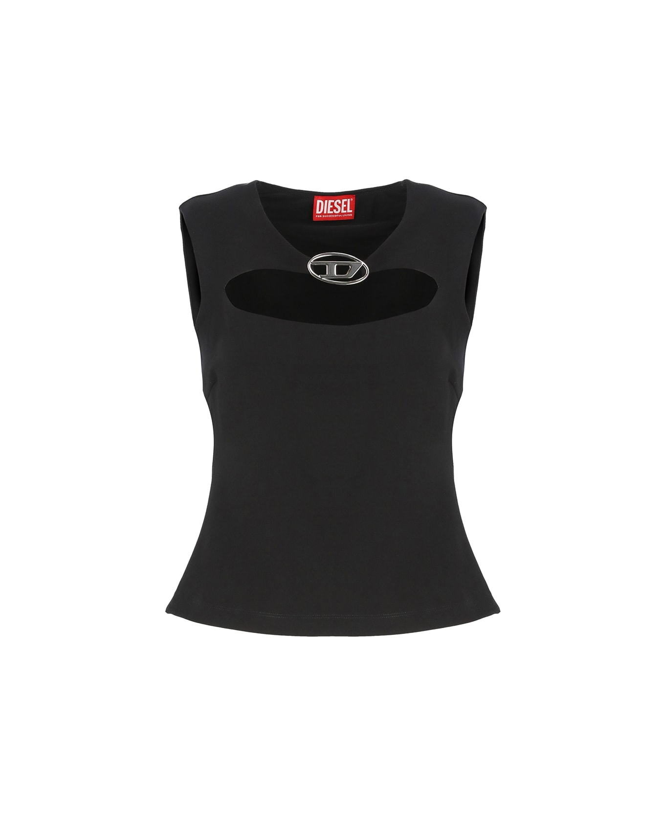 - Black Diesel top for woman - Crew neckline - Sleeveless - Front metal logo with cut out detail Composition: 67% Viscose, 28% Nylon, 5% Elastane