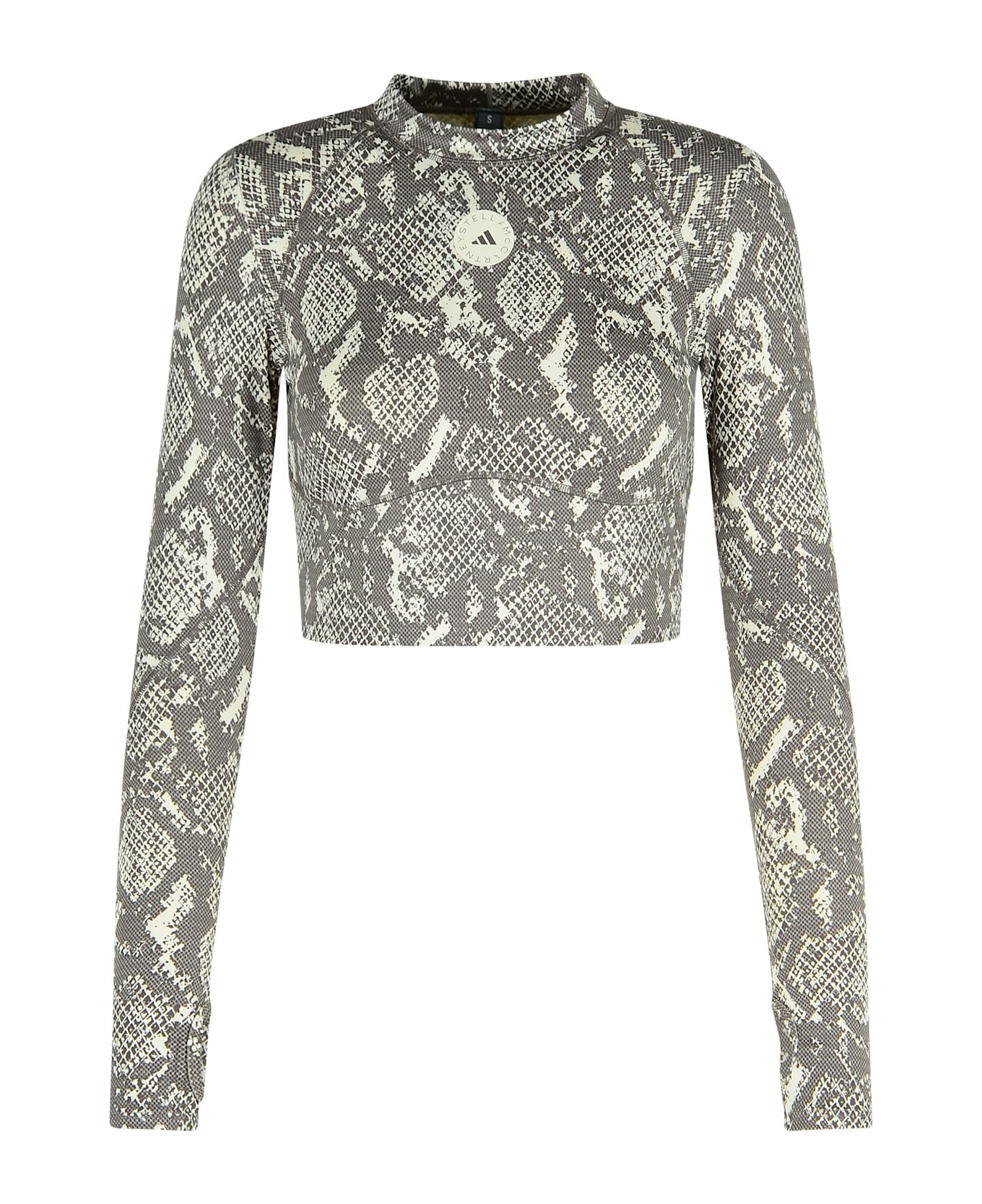 Made of stretch polyester, exposed stitching, snakeskin pattern, tonal front logo, short cut, thumb hole cuffs Composition: 73% polyester, 27% elastane